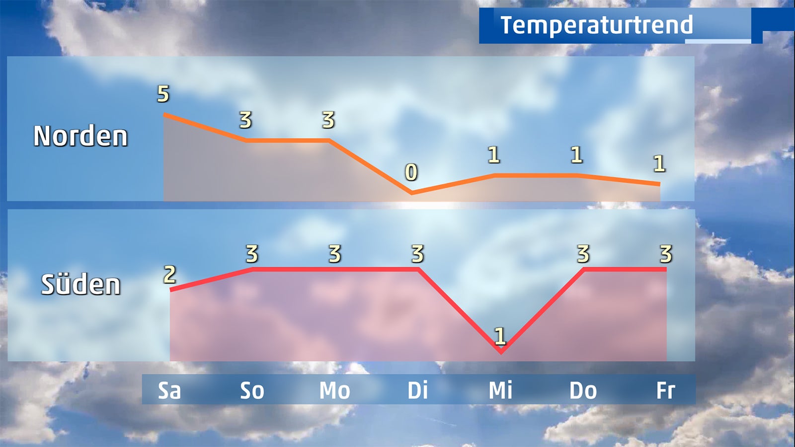 Freundlicher und trocken ist es hingegen im Norden und Süden, wo einige Sonnenstunden zu erwarten sind. Am Abend nähern sich von der Nordsee jedoch teils kräftige Schneeregenschauer. Vor allem im Straßenverkehr gilt Vorsicht vor Glätte. Die Temperaturen bewegen sich zwischen -3 Grad im Nordosten und +6 Grad im Südwesten.