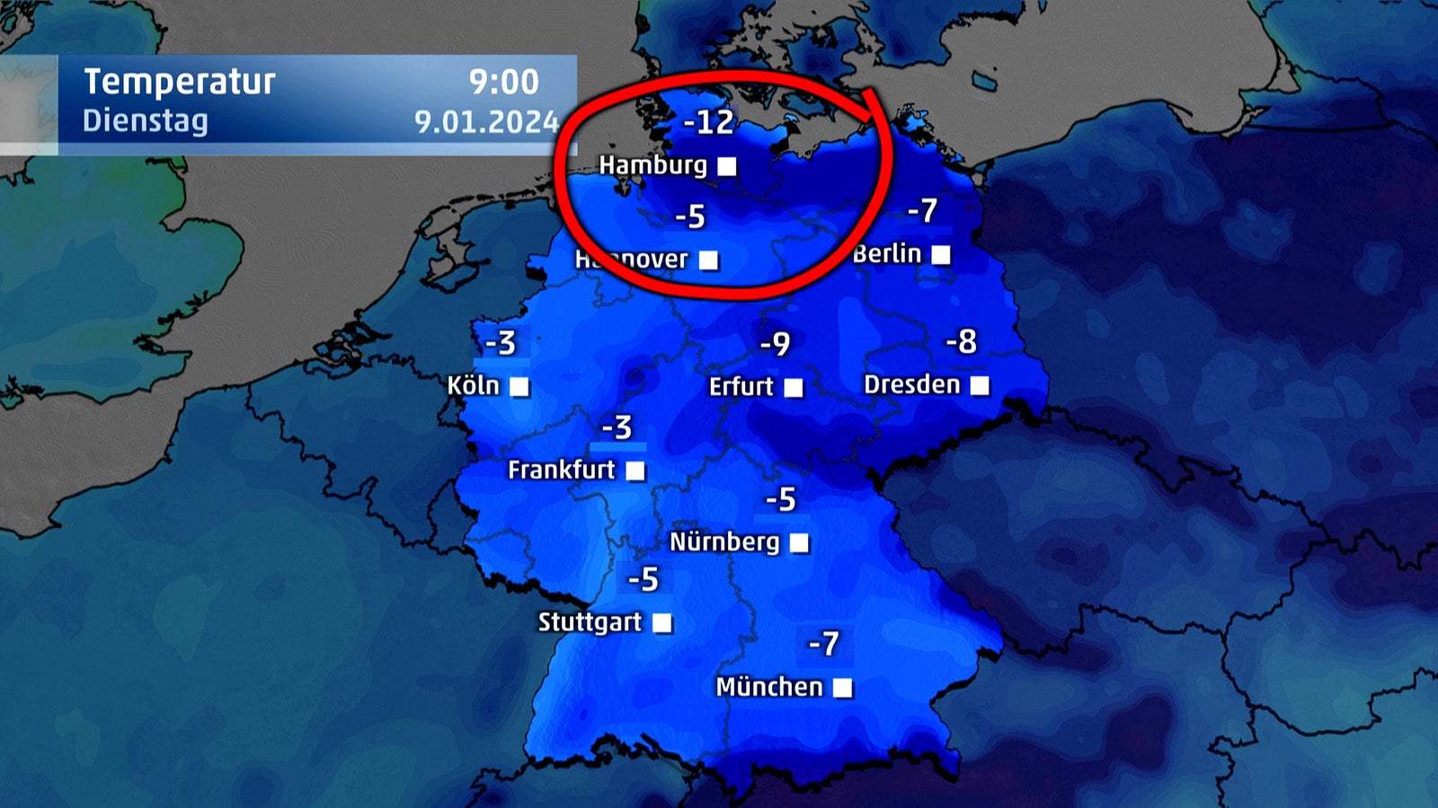 Aufgrund der winterlichen Witterung liegt sogar ganz Norden und Süden sogar Schnee. Und die Temperaturen haben ab sofort ein Minus vor der Ziffer. Denn die Höchstwerte steigen in dieser Woche nur direkt an der Küste über 0 Grad. Ansonsten gibt es bis zu 5 Eistage in Folge. Höchstens in den Innenstädten kann es ab Mittwoch leicht und kurz positive Werte geben. Erst ab Samstag wird es von Westen her wieder wärmer, so dass die Höchstwerte knapp über den Gefrierpunkt steigen.