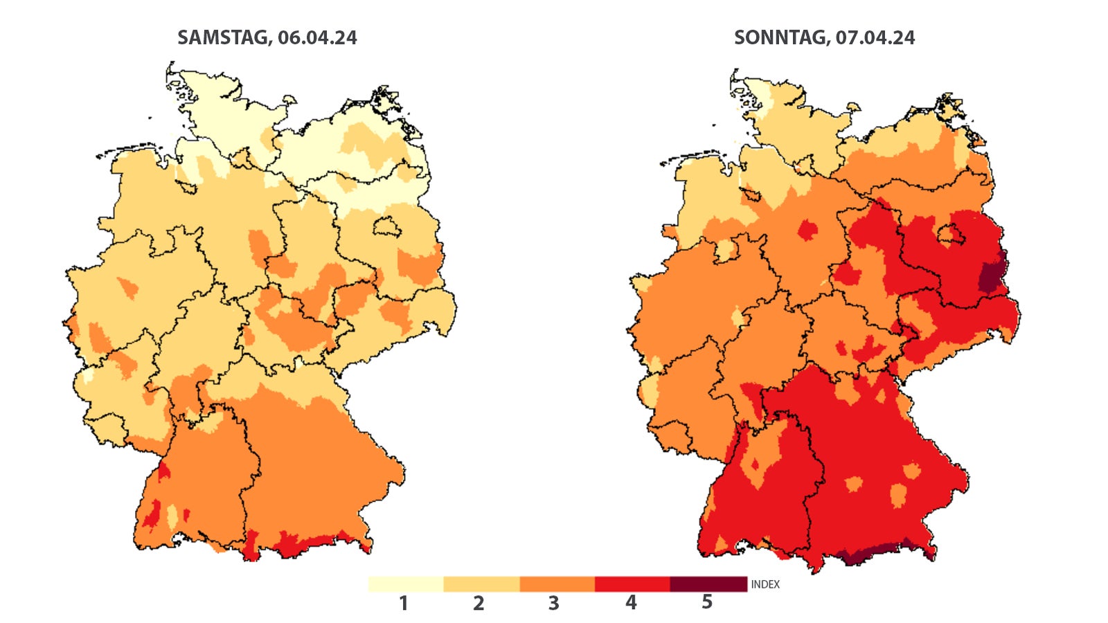 Am Sonntag weitet sich dann die Waldbrandgefahr auf weite Teile des Südens und Ostens aus. Auch einige Landesteile in der Mitte und im Norden sind betroffen. An den Alpen und im Südosten Brandenburgs herrscht die höchste Gefahrenstufe 5!