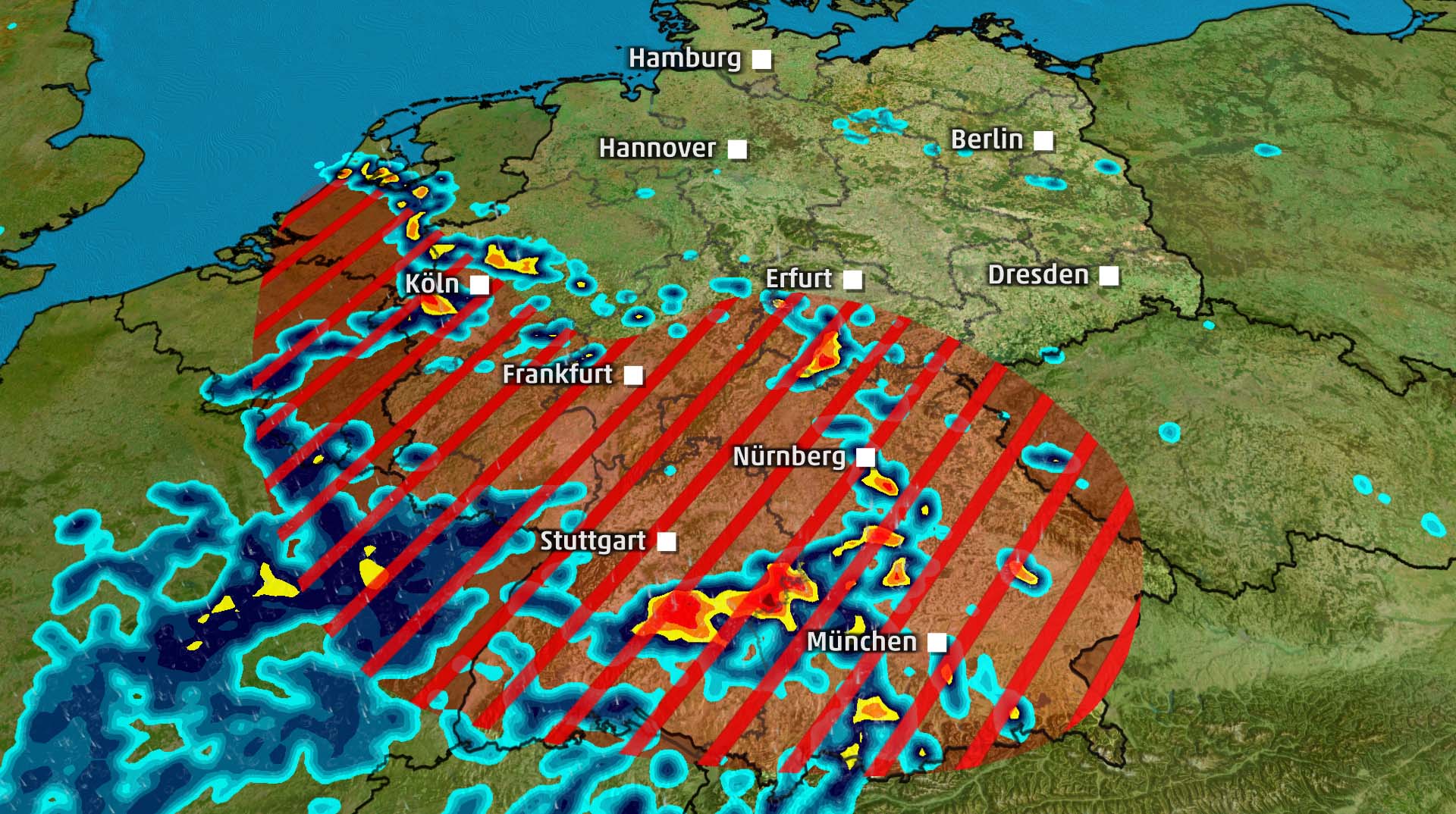 Am Nachmittag haben die Gewitter dann schon ungefähr eine Linie von Essen bis Nürnberg erreicht.
