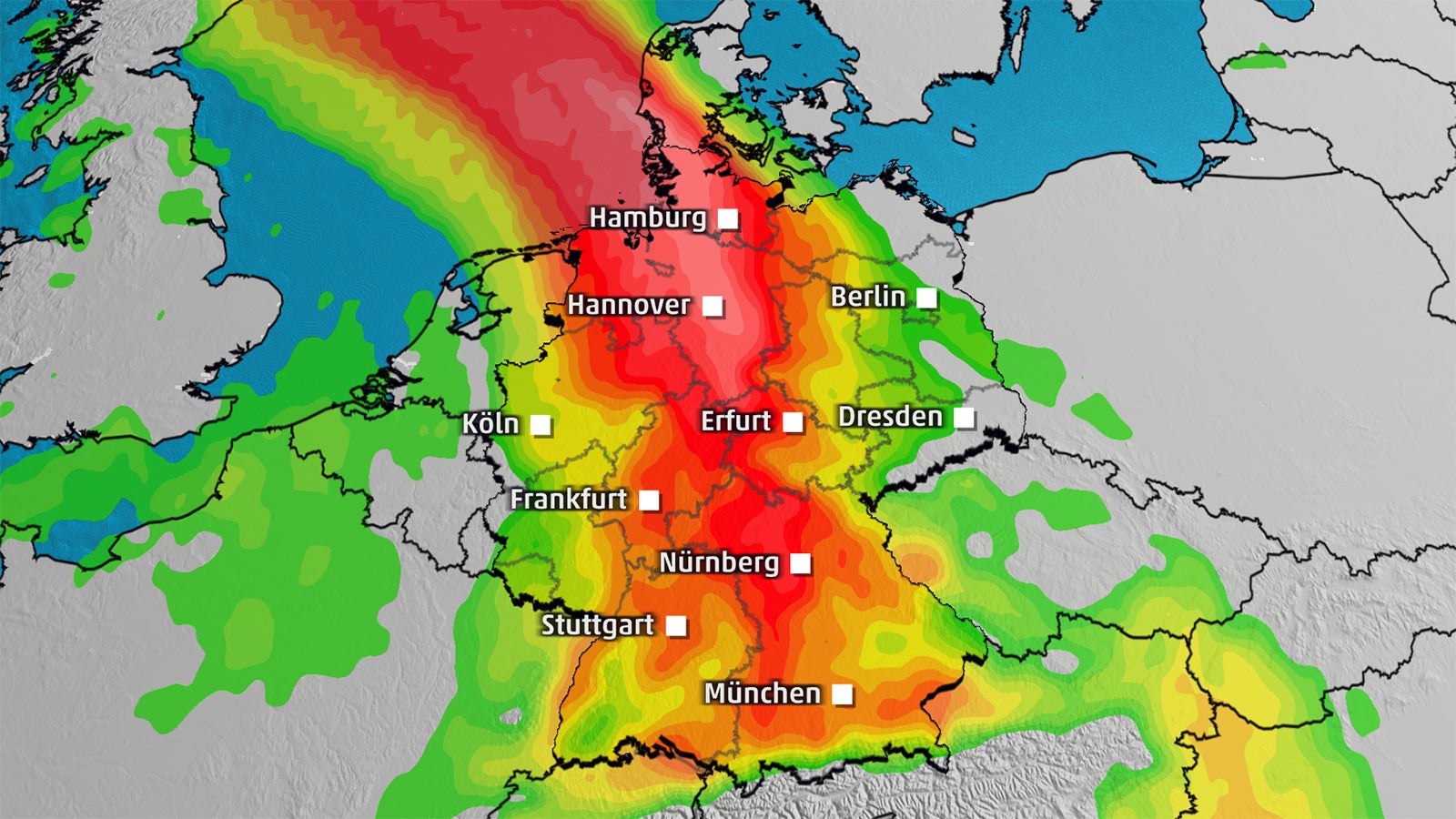 Im Laufe der Woche dreht sich der Wind über Deutschland sogar ein. Das heißt, dass die Luft aus Süden kommt und dann nach Westen abdreht. Und damit müssen wir in der neuen Woche vor allem mit Starkregen rechnen – und das auch mehrfach.