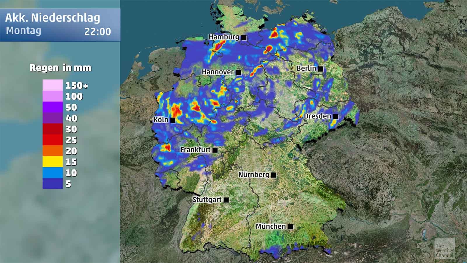 Am Montag bewegt sich abermals ein Tief über Deutschland hinweg und bedingt die Bildung neuer Gewitter. Vornehmlich wird der Schwerpunkt dieser Unwetter in Friesland, im Emsland und in Mecklenburg-Vorpommern sein. Wegen der geringen Geschwindigkeit kommt es zu erneuten Starkregenereignissen.