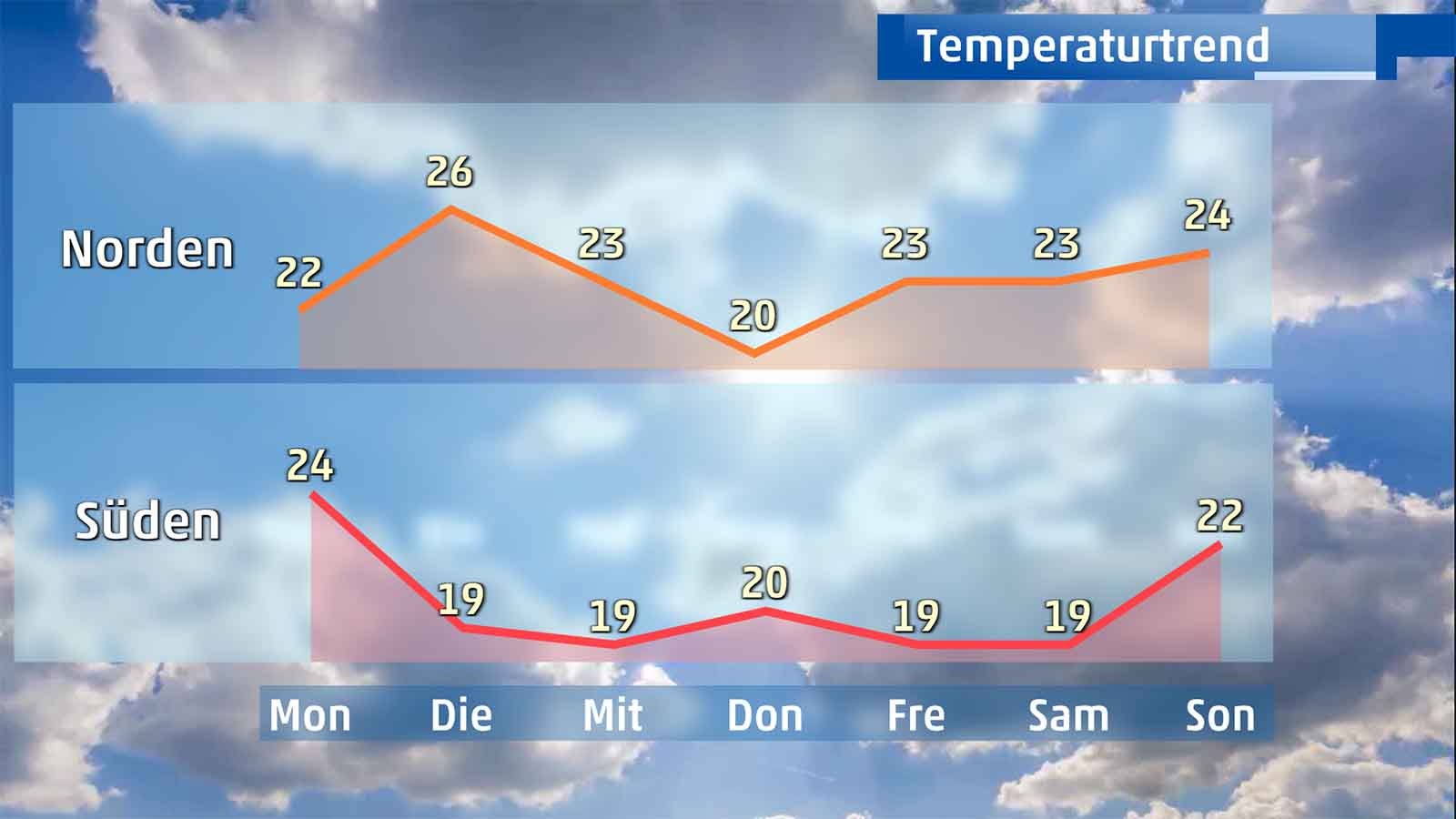 Aufgrund des Hochdruckeinflusses heitert es im Norden und Nordosten auf. Die Temperaturen erreichen mit 25 bis 29 Grad sommerliche Höhen. Bei Tageshöchstwerten von 19 bis 24 Grad in der Mitte des Landes sollte man örtlich mit gewittrigem Regen rechnen. Es kommt lokal zu Starkregenereignissen und Hagelschlag.