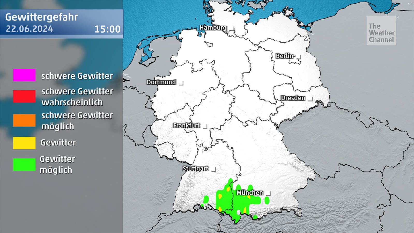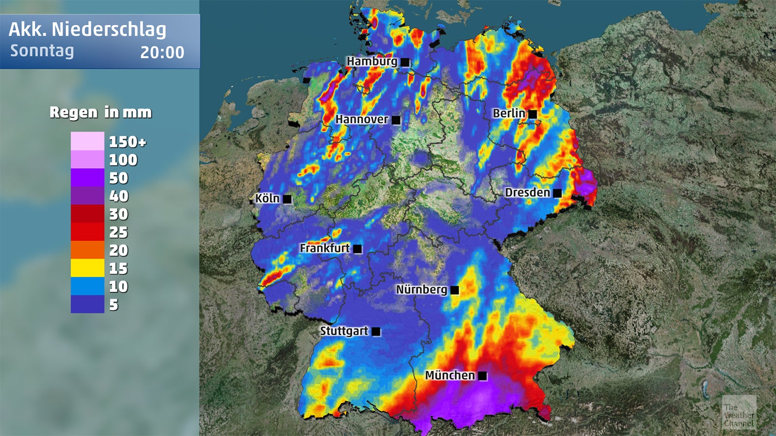 Südlich der Donau bis ins südliche Alpenvorland besteht am Samstag noch Gewitterrisiko. Lokal kann es erneut zu Starkregenereignissen kommen, bei denen in kurzer Zeit bis zu 20 l/qm oder komprimiert auf wenige Stunden bis zu 30 l/qm fallen können. Über die Mittagsstunden gibt es eine kleine Verschnaufpause und die Gewitterneigung flacht kurzzeitig ab. Dabei bleibt es jedoch nicht: In den späten Nachmittagsstunden treten Gewittergeschehnisse wieder zunehmend aus den Alpen heraus auf. Neben unwetterartigen Regensummen kommt es in Gewitternähe zu Windböen von bis zu 70 km/h.