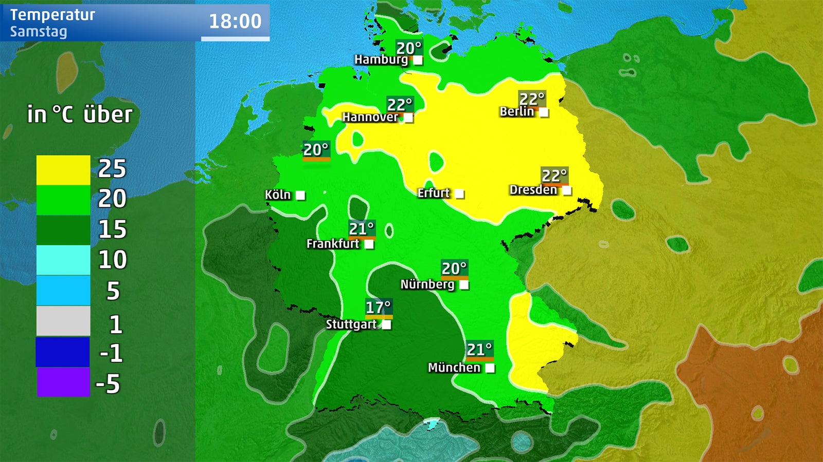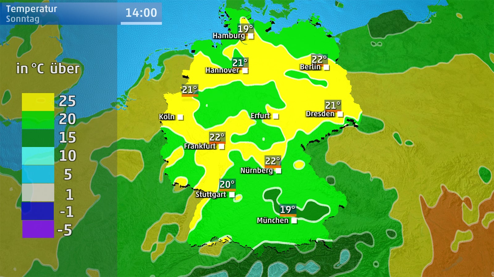 Aufgrund von Quellwolkenbildung wird der Sonnenschein im Laufe des Tages weniger. Am Abend besteht in Alpennähe und im Bergland die Möglichkeit erneuter Schauer, die auch mal gewittrig ausfallen können, aber kein Unwetterpotenzial mehr besitzen. Die Tageshöchstwerte liegen zwischen 19 und 26 Grad.
