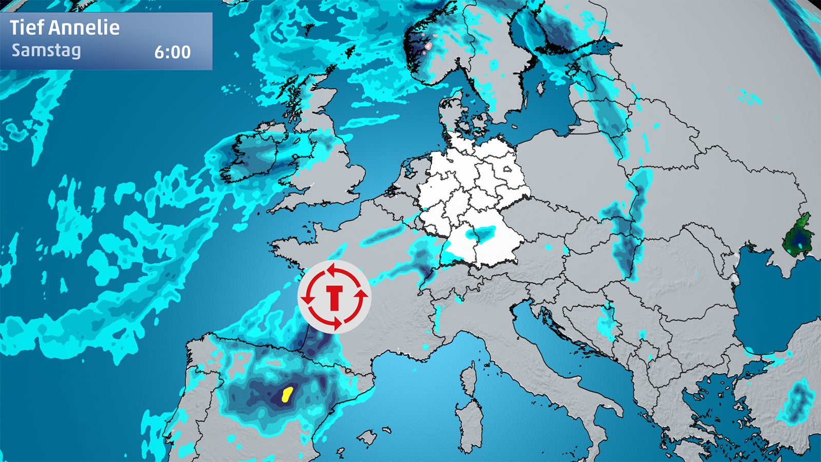 Das Sturmtief Annelie bildete sich am Freitag über der Iberischen Halbinsel und bahnt sich seinen Weg über Frankreich nach Deutschland. In der Nacht wird es uns überqueren. Die Zugbahn des Tiefs verläuft voraussichtlich vom Südwesten und Süden bis nach Niedersachsen und Sachsen-Anhalt und erstreckt sich dann in den Osten. Die extrem warmen und feuchten Luftmassen, die das Tief mit sich bringt stellen einen höchst gefährlichen Energieträger dar.
