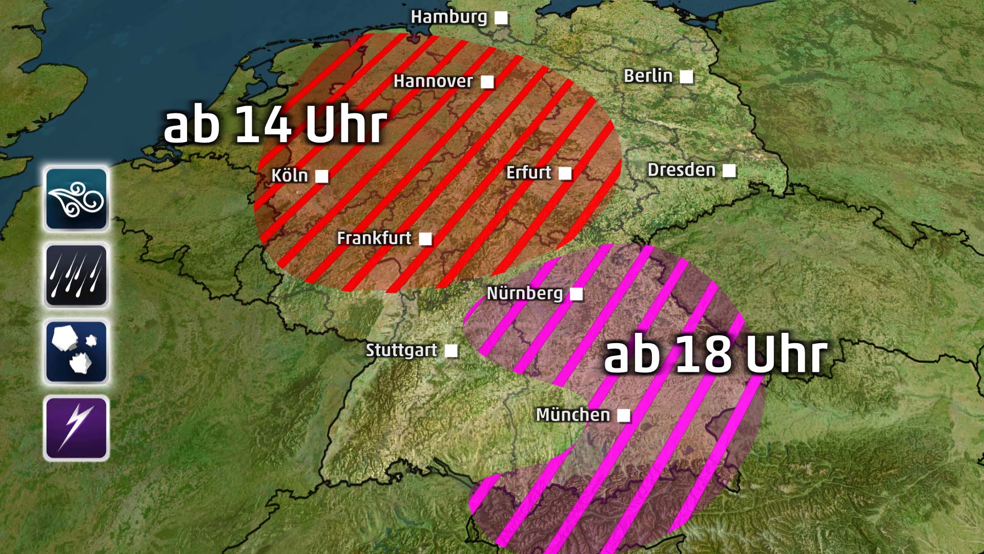 Im Norden und Westen ist es mit den Gewittern gegen 21 Uhr vorbei und es schauert nur noch. Im Süden hingegen geht es erst gegen 18 Uhr so richtig los. Aus den Alpen und auch aus dem Bayerischen Wald ziehen Gewitter heraus. Besonders am Alpenrand und in Franken kann es starke Unwetter geben. Auch hier ist Starkregen sicher das häufigste Unwetter, aber auch Hagel und vereinzelt auch Sturmböen sind möglich.