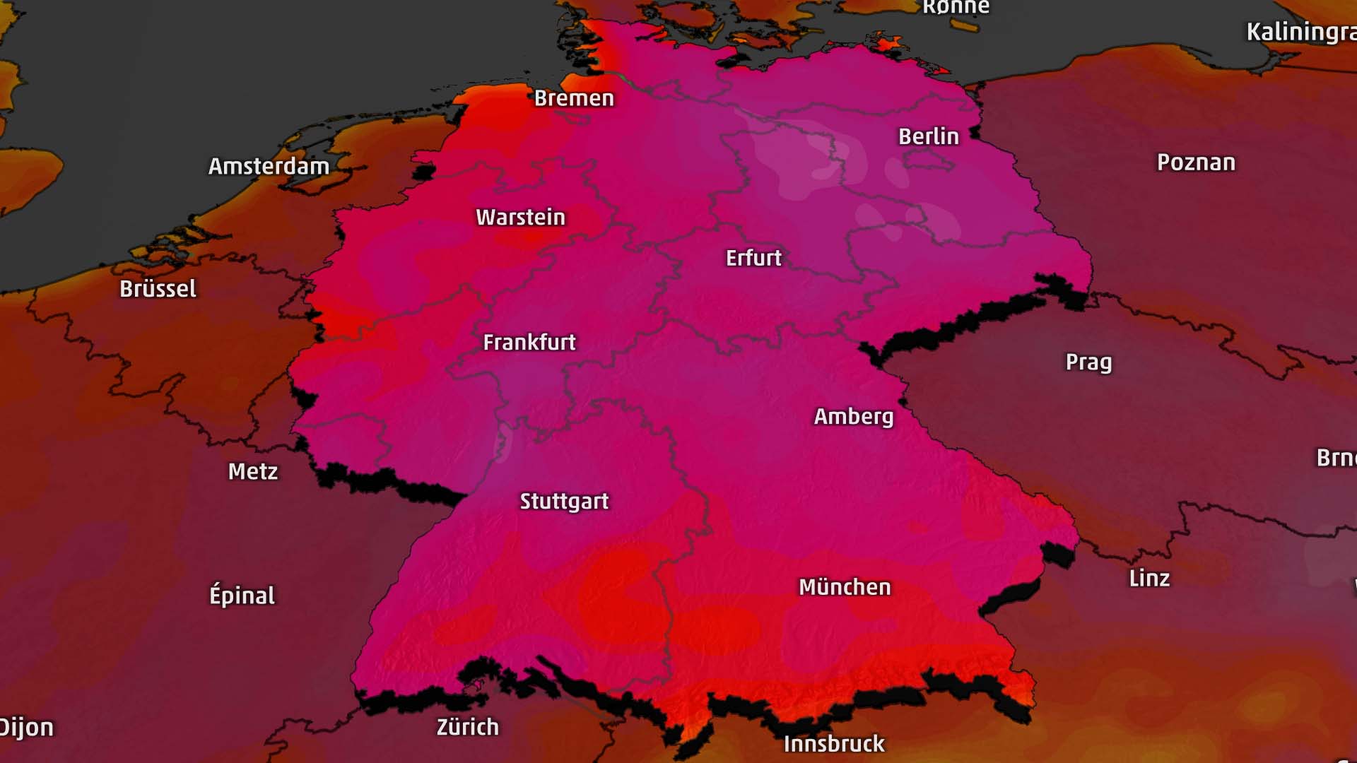 Der heißeste Tag erwartet uns nach derzeitigen Prognosen nächste Woche Samstag, dem 31. August. Die Höchstwerte können 37 Grad an Rhein und Main erreichen. Und auch im Osten, rund um Berlin, wird es nochmal richtig heiß.