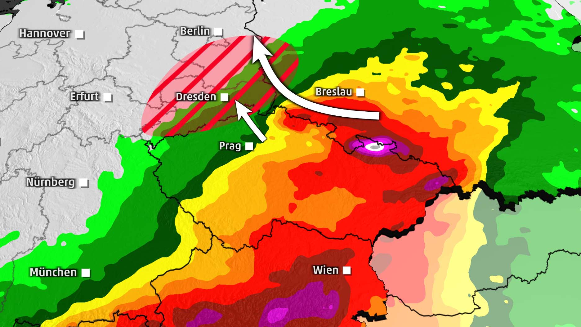 Aber besonders für Österreich, Tschechien und Polen wird es dramatisch. Südlich der Alpen könnte gewittriger Starkregen die Lage lokal verschärfen.