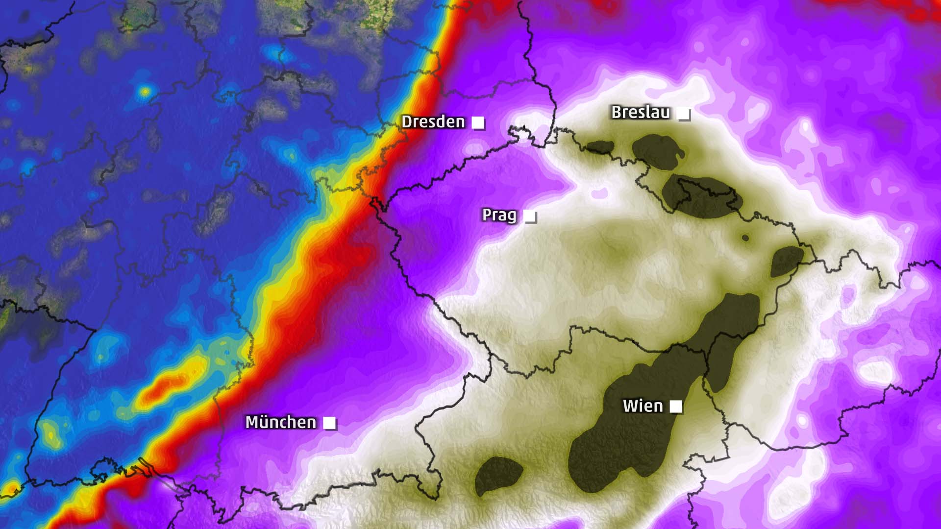 In Österreich sind ebenfalls extreme Niederschlagsmengen vorhergesagt: 400 bis 500 Liter Niederschlag pro Quadratmeter könnte an der Nordflanke der Alpen fallen. Allerdings hilft hier ein wenig das kühle Wetter. Denn ab 1300 Metern geht der Regen in Schnee über. Das bedeutet, dass es an der Donau vielleicht nicht sofort zu Hochwasser kommen wird. Dennoch könnte es ein ziemliches Chaos geben, wenn es zu einem so frühen Wintereinbruch kommt. Eine Schneewalze kommt auf das Bergland zu und viele Alpenpässe könnten zumindest zeitweise einschneien. Schnee auf der Zugspitze gab es bereits in der vergangenen Nacht.