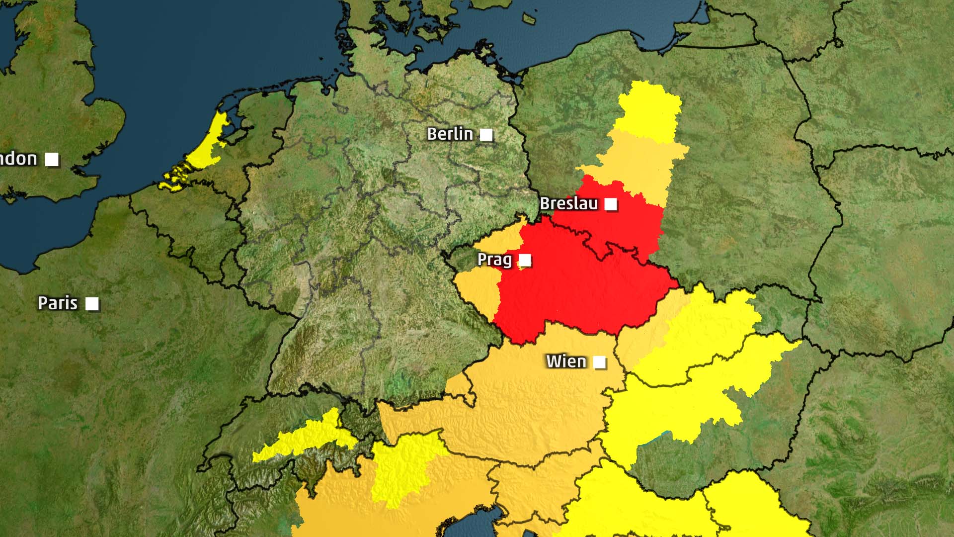 Polen und Tschechien haben bereits Alarmstufe Rot ausgerufen. Auch Prag und Breslau liegen in den gefährdeten Gebieten (Stand: Donnerstagvormittag)