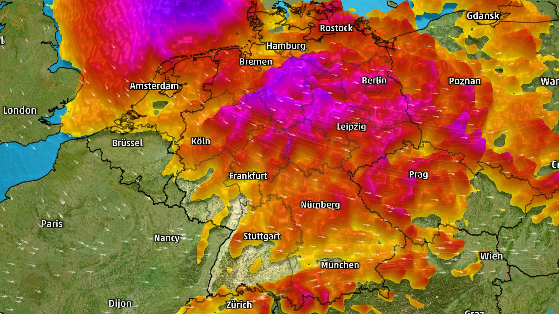 An der Nordsee und in den Bergregionen sind Sturmböen bis zu 90 km/h möglich, während in den Hochlagen des Harzes und Erzgebirges sogar schwerer Sturm (Bft 10) auftritt.