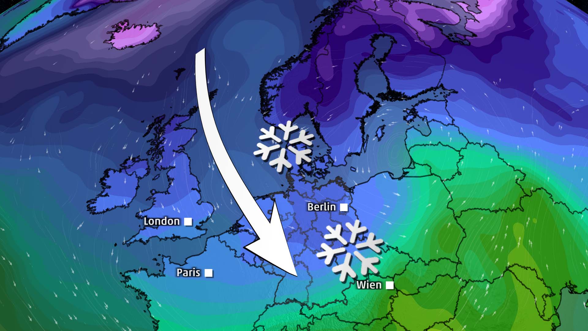 Eine Kältewelle kommt auf Deutschland zu. Sturm Quiteria bringt nicht nur stürmisches Wetter zu uns sondern auch Kaltluft. Es stürmisch und an der Kaltfront im Süden kann es zeitweise sehr gefährlich werden mit Gewittern und schweren Sturmböen.