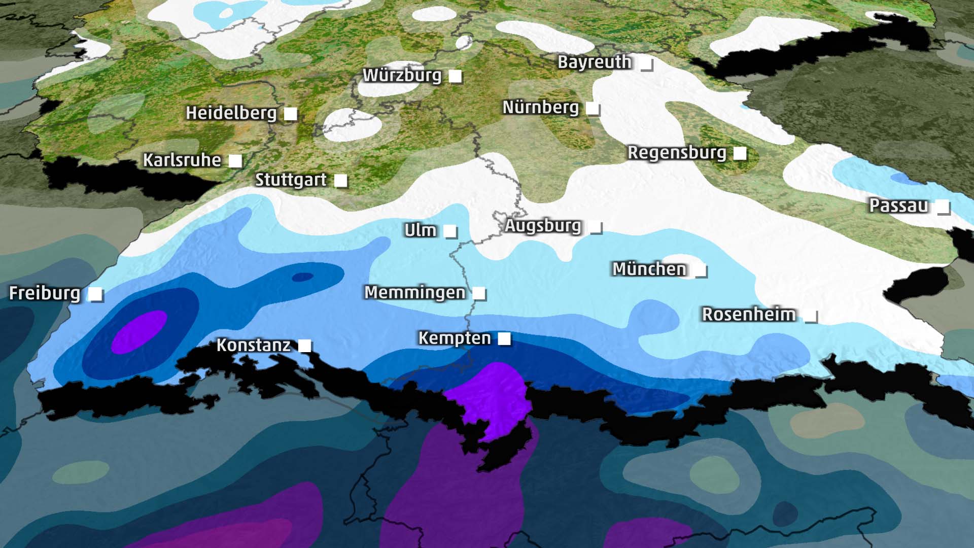 Besonders schwer trifft es den Schwarzwald und das Allgäu. In Hochlagen sind im Schwarzwald 30 Zentimeter Neuschnee möglich und im Allgäu summiert sich der Schnee auf und es kann ein halber Meter Neuschnee zusammenkommen.