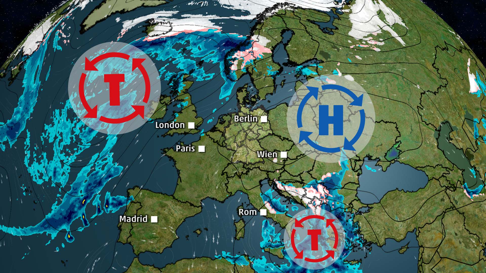Der Dezember wird von Hochdruck geprägt sein: Am kommenden Wochenende stellt sich ein Wettermuster ein, das uns noch sehr lange begleiten könnte. Deutschland liegt am Rande eines Hochdruckgebiets über Osteuropa: Über Griechenland regnet es und vor den Britischen Inseln baut sich ein neuer Sturm auf.