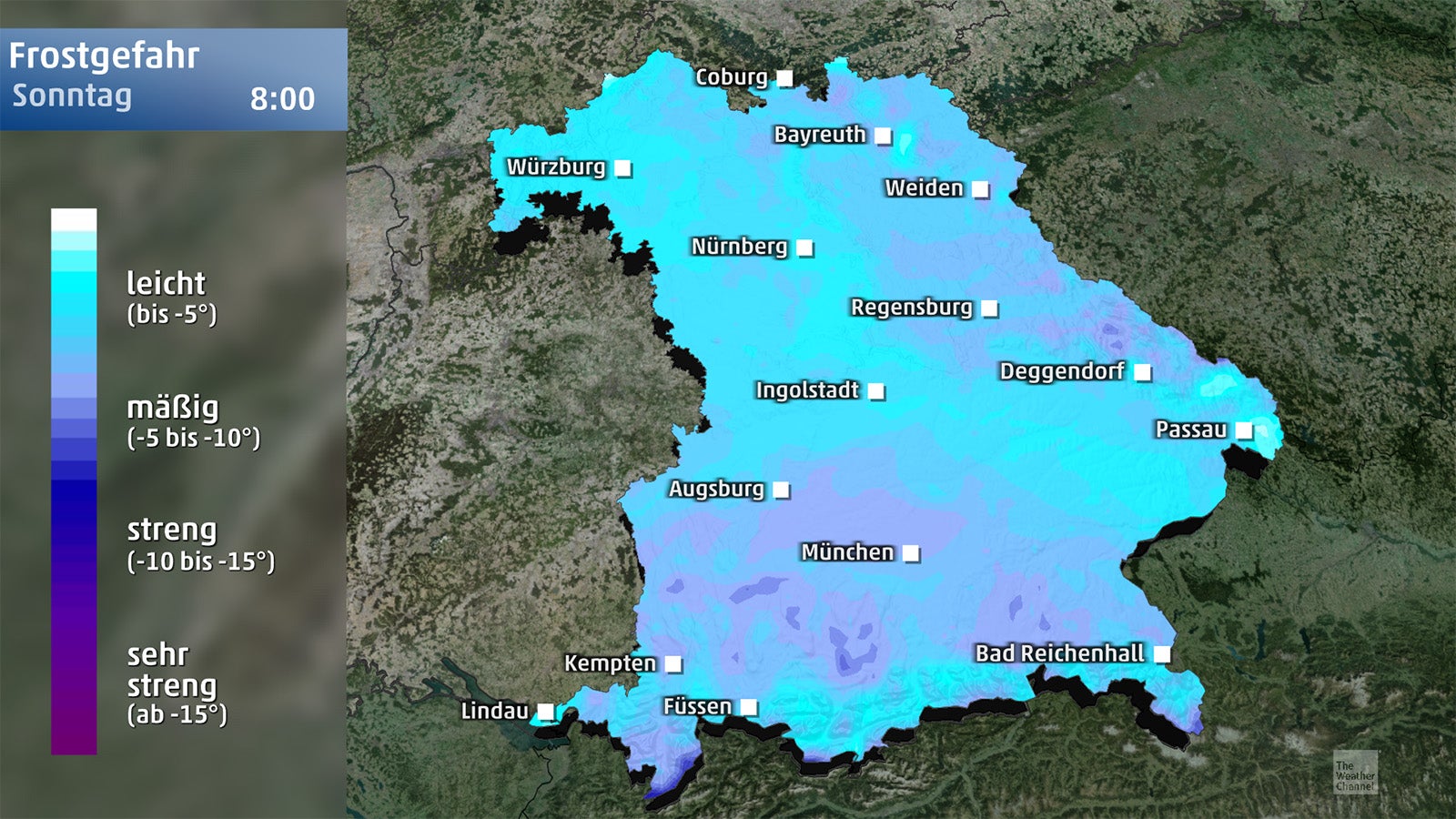 In der Nacht zum Samstag wird es teilweise nebelig. Bei Temperaturen zwischen -1 bis -5 Grad ist mit Frost und Glätte zu rechnen. An den Alpen fallen die Temperaturen teils unter -8 Grad. Am Samstag zeigt sich häufiger die Sonne. Bei Höchstwerten zwischen 1 und 5 Grad. Der Wind ist schwach bis mäßig, in Franken und im Alpenvorland zeitweise auch auffrischend.