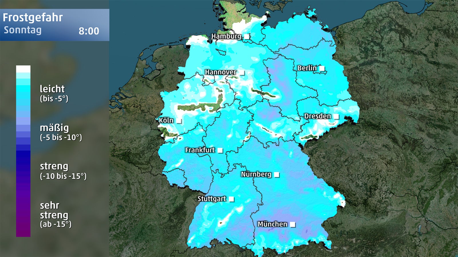 Die Nacht zum Sonntag verstärkt die winterliche Kälte. Unter einem klaren oder nur leicht bewölkten Himmel kühlt die Luft noch stärker ab als in der vorherigen Nacht. Die Tiefstwerte liegen verbreitet zwischen -5 und -8 Grad, in geschützten und schneebedeckten Tälern ist sogar noch kälterer Frost mit Temperaturen unter -10 Grad möglich. Diese klaren Verhältnisse fördern nicht nur das typische "Knistern" des Frostes, sondern auch die erneute Bildung dichter Nebelfelder.