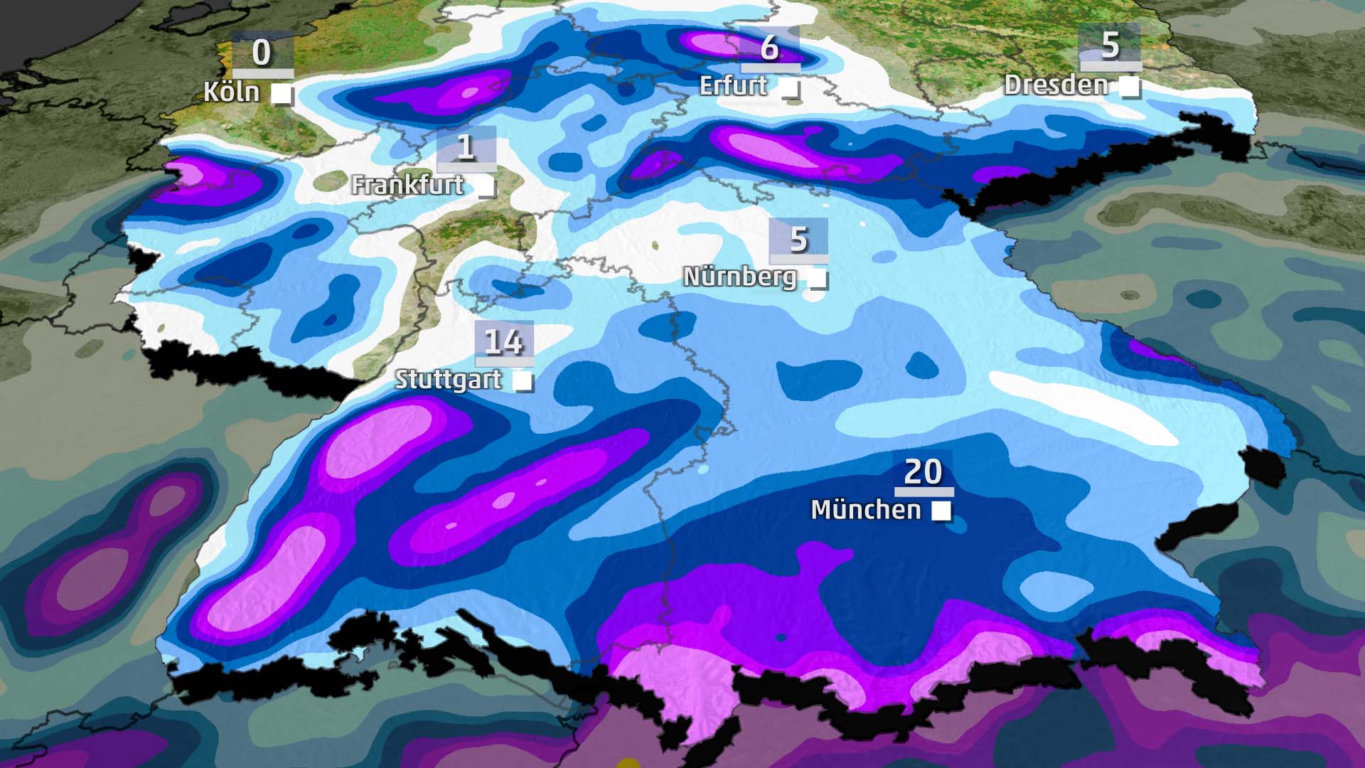 Bis Sonntagabend erreichen die Schneemengen 2 bis 10 Zentimeter, in Staulagen auch 20 Zentimeter. In den westlichen Mittelgebirgen, südlich der Donau und an den Alpen kann es außerdem zu einem Schneesturm kommen.