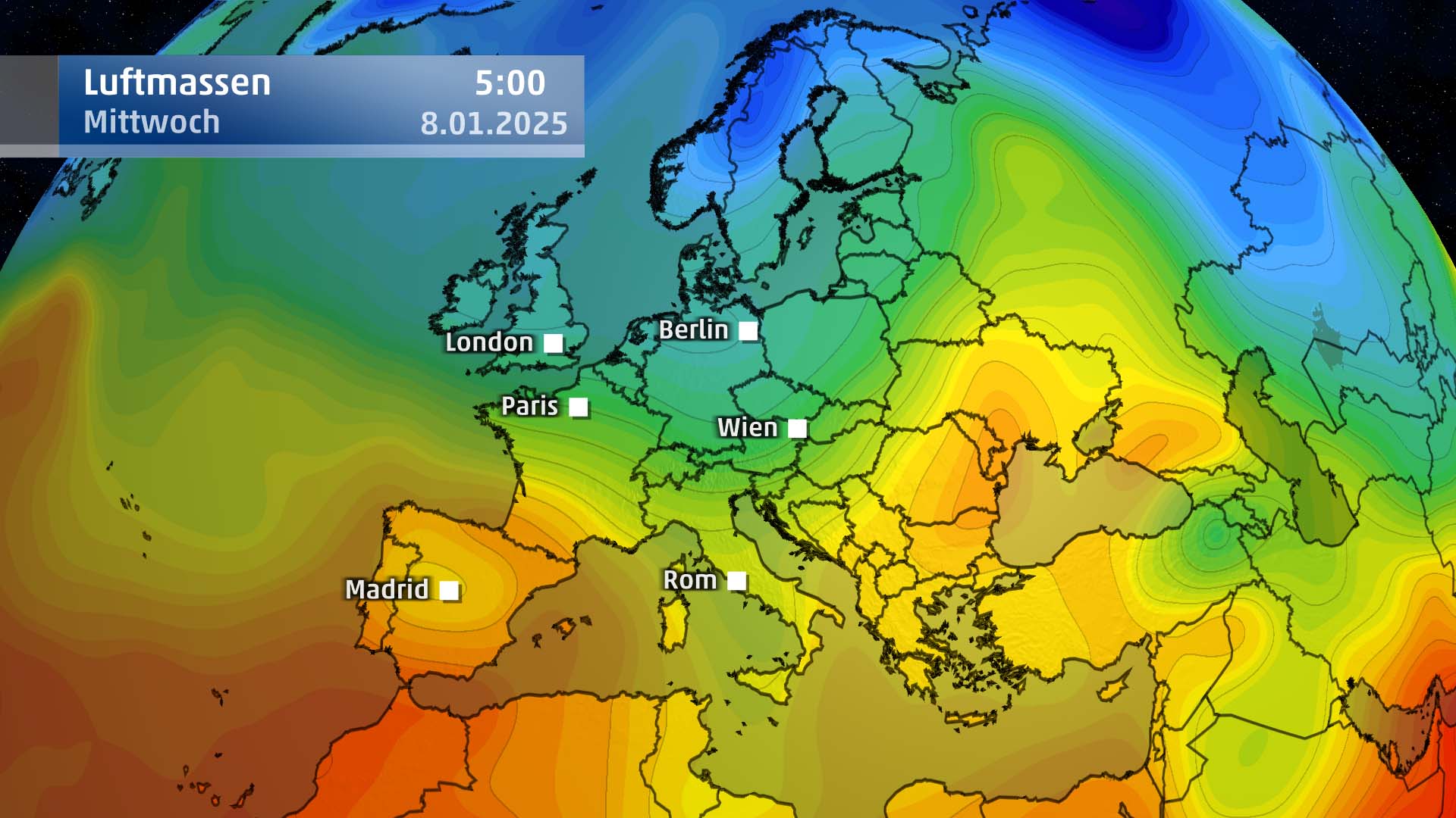 Am Montag ist es im Südosten verbreitet trocken. Die Temperaturen erreichen maximal 5 Grad. Im Westen zeigt sich unbeständiges Schauerwetter mit extrem milden Temperaturen, die bis auf 15 Grad steigen können. Im Bergland sind bei Sonnenschein sogar höhere Werte möglich. Die milde Höhenluft setzt sich sukzessive bis in die Niederungen durch. Am Abend fällt Regen, bedingt durch den Aufzug einer Kaltfront, die zu einem kleinen Randtief gehört.