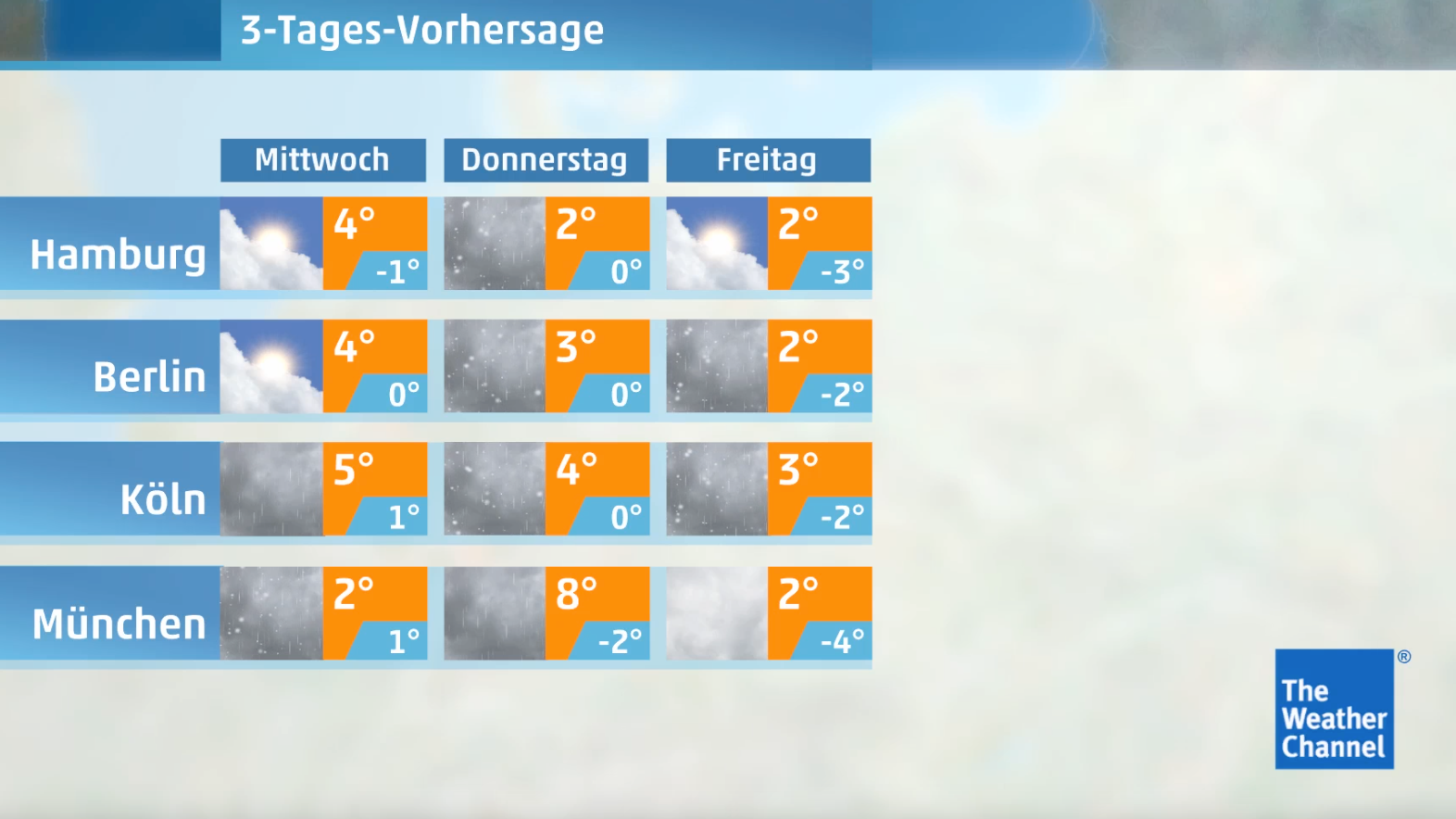 Am Dienstag zeigt sich das Wetter wechselhaft. Teils ist es stark bewölkt, teils gibt es Schauer. Oberhalb von 500 bis 700 Metern fallen Schauer als Schnee. Im Nordseeumfeld und im Westen sind kurze Gewitter möglich. Die Temperaturen klettern auf Höchstwerte von 3 bis 9 Grad. Es weht ein mäßiger bis frischer Südwestwind. In höheren Berglagen und an der See drohen Sturmböen.