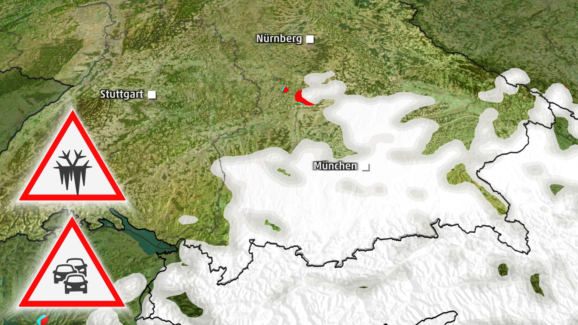Südlich von München geht der Regen dann wieder in Schneefall über: Hier herrscht also die Gefahr von Schneeglätte.
