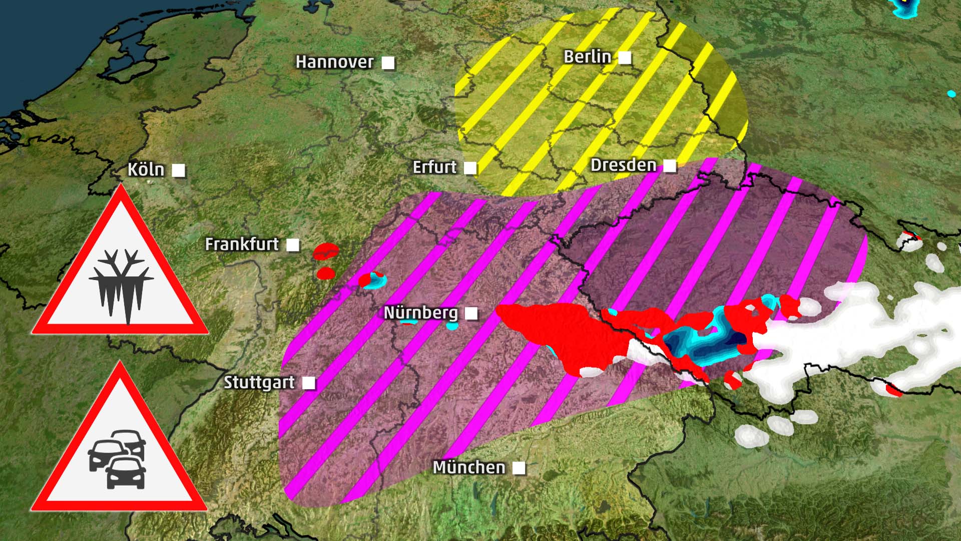 Am Mittwochmorgen verstärkt sich der Regen im Süden nochmal. Es droht Blitzeis im Berufsverkehr - zwischen 5 und 9 Uhr - insbesondere zwischen Nürnberg und München.