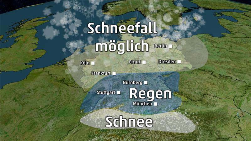 Damit kann es im Norden schneien, bei Höchstwerten um die 5 Grad, während es im Süden relativ mild bleibt. Am Rhein liegen die Höchstwerte dann immer noch bei 12 Grad.