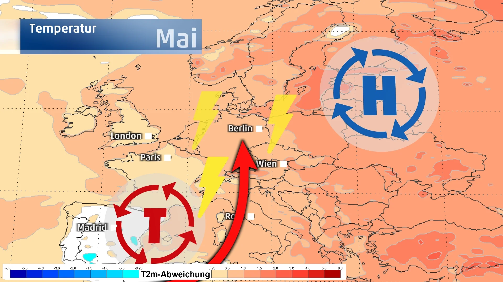 Es sieht danach aus, dass es in Südeuropa zu heftigen Regenfällen in diesem Mai kommen könnte aufgrund des Tiefdrucks. Das heißt für uns: Es kommt immer wieder sehr warme und wassergetränkte Luft nach Deutschland und trifft hier auf etwas kühlere Luftmassen. Dadurch steigt das Gewitter-Risiko.