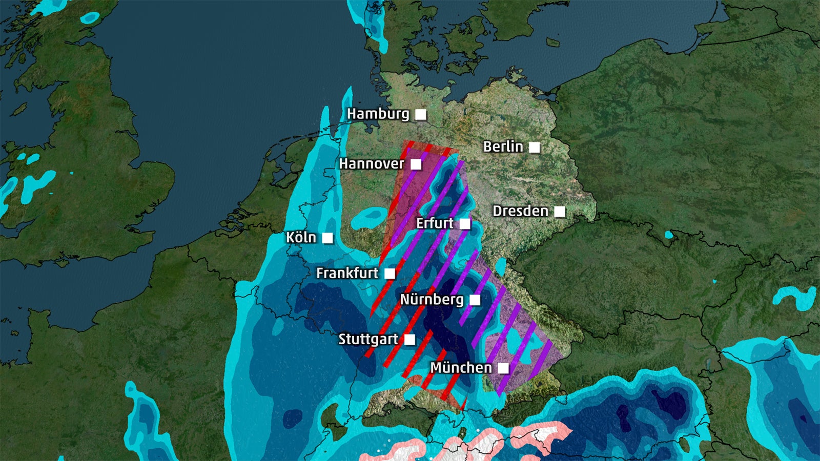 Am Donnerstag entstehen die Gewitter entweder im Allgäu oder südlich von München. In beiden Fällen werden die Gewitter unter Verstärkung nach Norden ziehen. Die westliche Route geht über Stuttgart und Frankfurt und die östliche über Ingolstadt und Nürnberg. Auch am Thüringer Wald können Gewitter entstehen, die ebenfalls nach Norden ziehen werden.