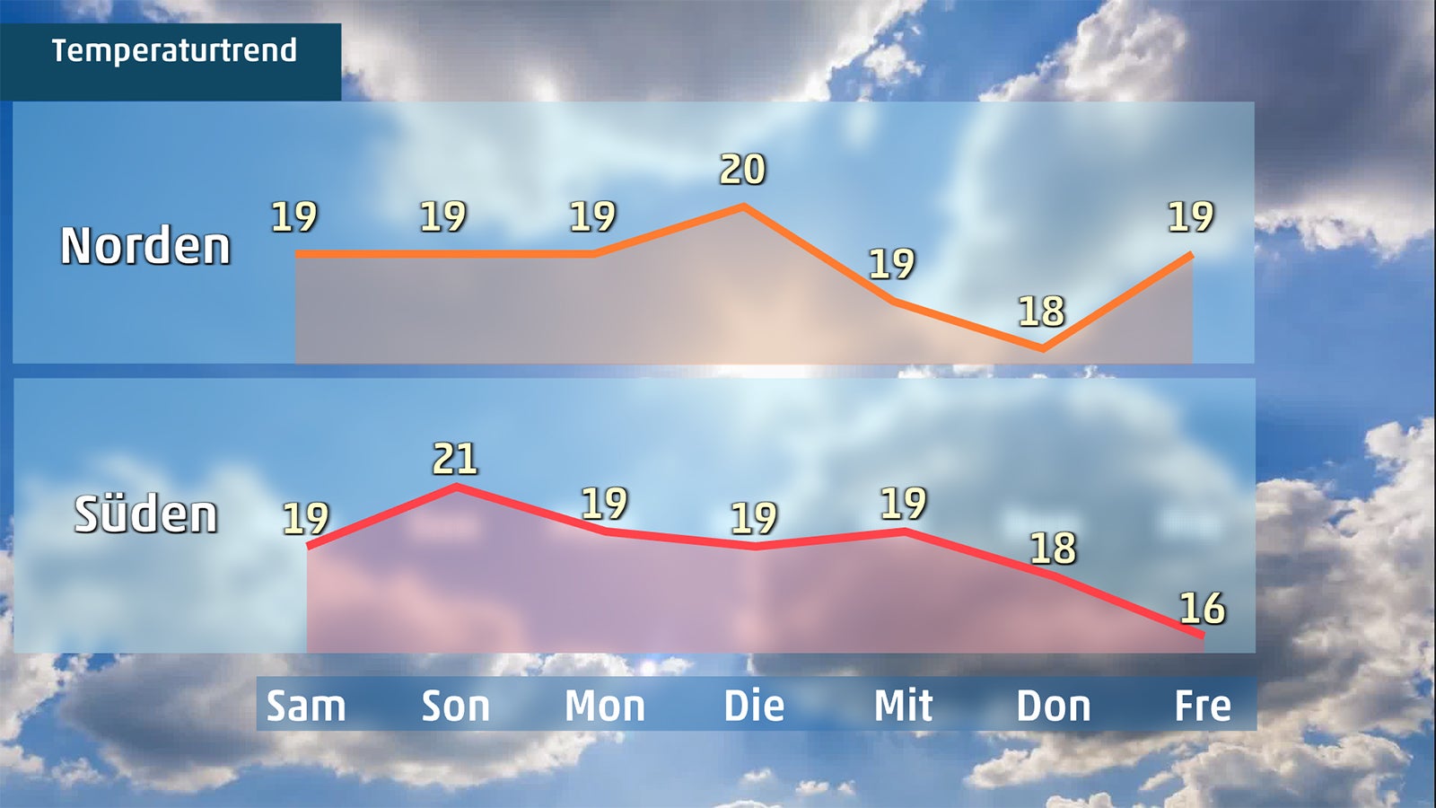 Zum Freitag wird es in der Osthälfte wieder freundlicher, vom Erzgebirge bis zum Bayerischen Wald könnten sich aber noch dichte Wolken und einzelne Schauer halten. Ansonsten scheint die Sonne bei 15 bis 23 Grad.