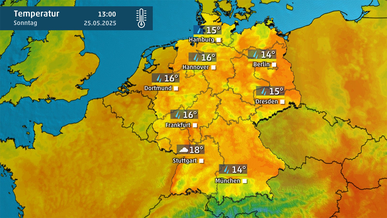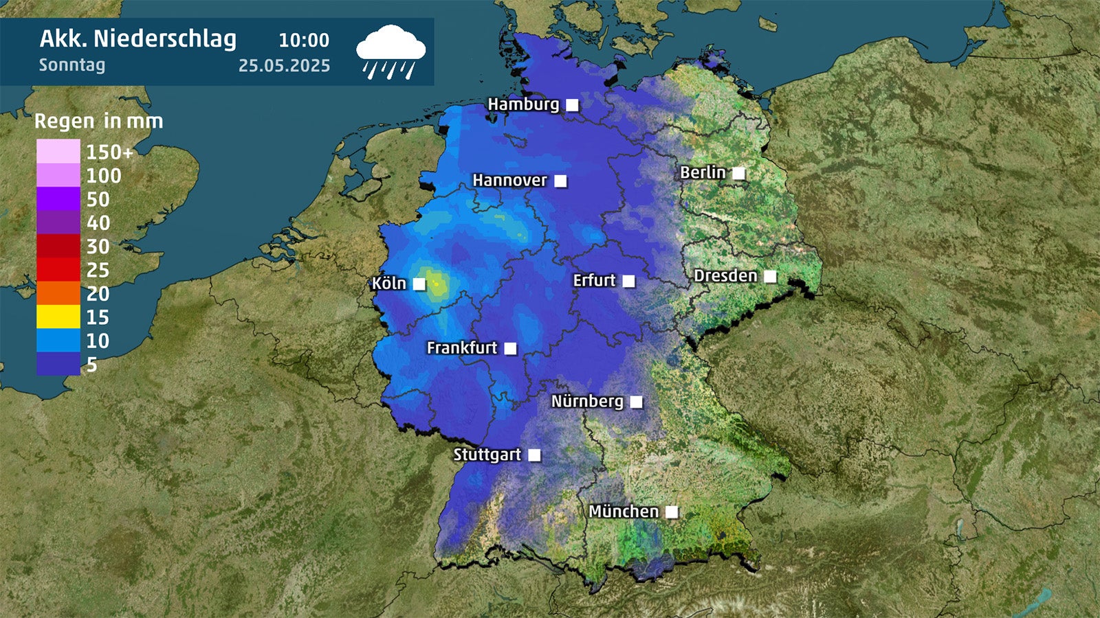In der Nacht zum Sonntag zieht der Regen weiter ostwärts, am Sonntagmorgen wird es dann abgesehen vom Gebiet östlich der Elbe überall nass. Tagsüber verlagert sich der Regenschwerpunkt in die Osthälfte, von der Ostsee über die östlichen Bundesländer bis an den Alpenrand bleibt es nass, während im Westen die Wolken zunehmend auflockern.