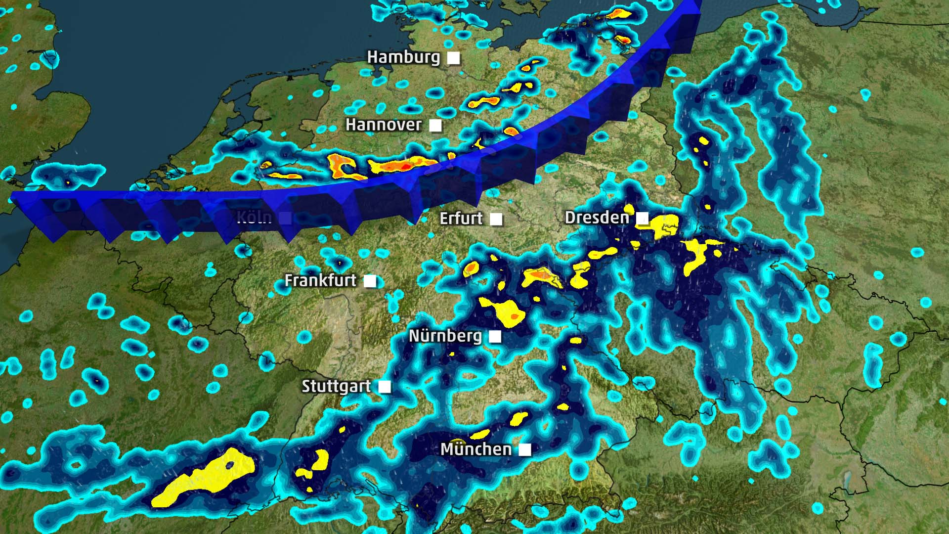 Zwischen 15 und 20 Uhr kann es zu Unwettern kommen. Nach 20 Uhr sind noch Gewitter südlich einer Linie von Stuttgart bis Nürnberg auch noch bis tief in die Nacht aktiv.