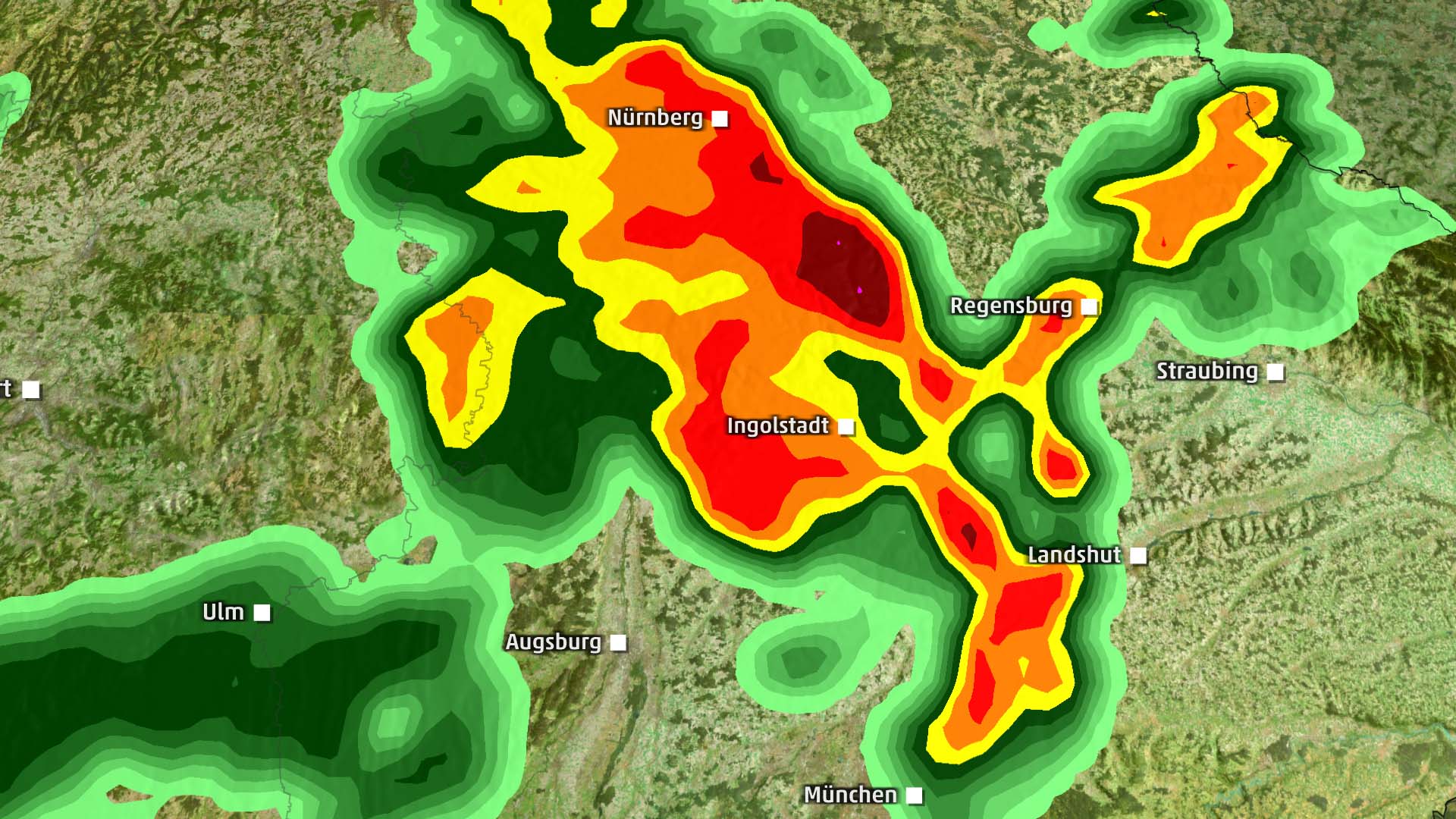 Um 21 Uhr können die ersten Gewitter bereits Straubing erreichen. Der Schwerpunkt der Unwetter liegt anschließend zwischen Augsburg und München.
