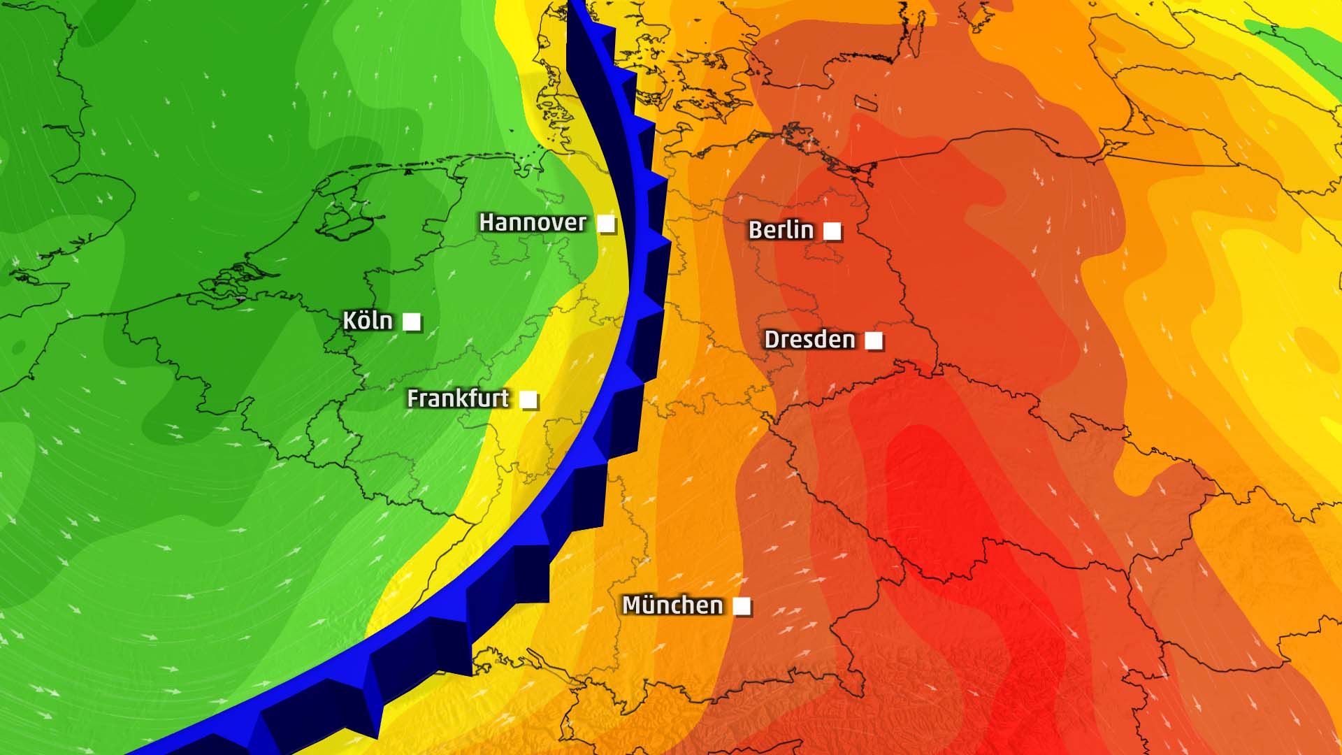 Über 35 Grad kommen jetzt auf Deutschland zu - zuerst im Westen, dann im Osten. Sogar eine kurze Hitzewelle kann es geben. Aber es folgt auch eine neue Gewitterlage, denn eine Kaltfront zieht über Deutschland hinweg. Und ab Sonntag wird das Wetter wieder kühler.