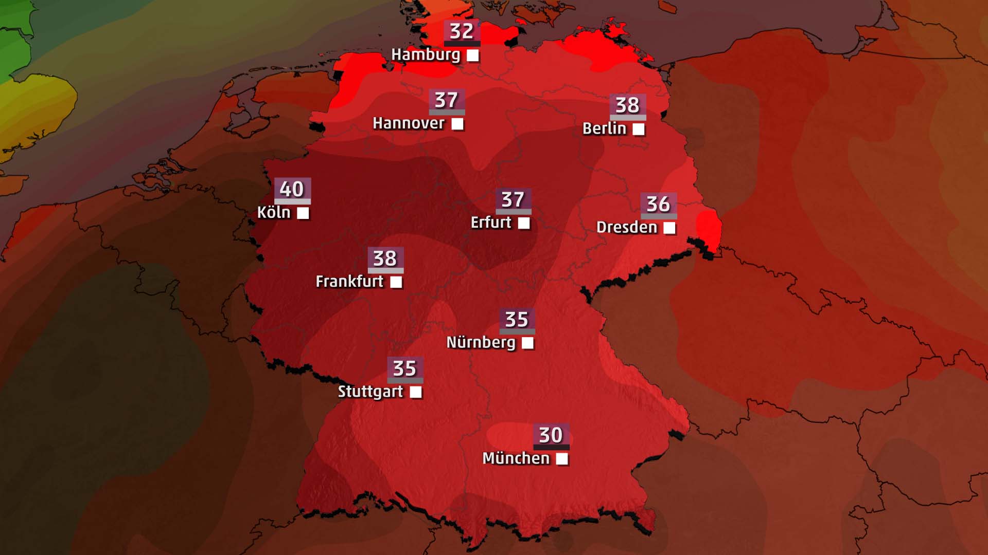 Die Temperaturen steigen immer weiter. Am heißesten wird es wahrscheinlich zwischen Frankfurt am Main und Basel, also in der Rhein-Main-Region oder am Oberrhein. Hier sind die 40 Grad schon gesetzt.