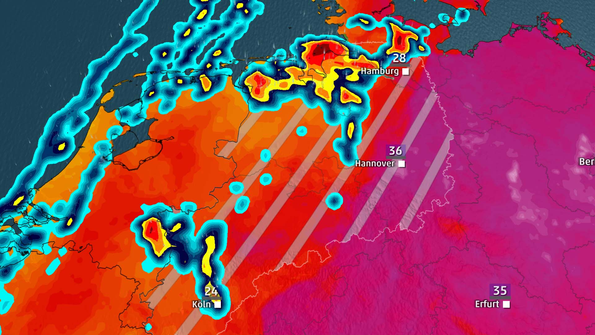 Auf einem breiten Streifen von Köln bis Hamburg formieren sich zwischen 16 und 20 Uhr sehr schwere Gewitter. Hier können auch Superzellen dabei sein. Auch die Tornado-Gefahr steigt.