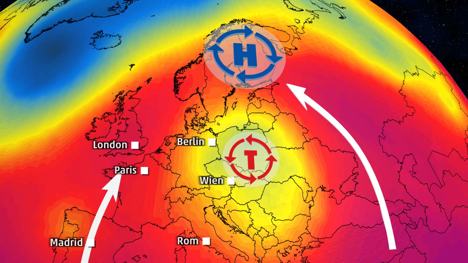 Im Prinzip war es zu viel Warmluft, die da nach Norden geflossen ist. Denn nun hat sich ein starkes Hoch über Norwegen gebildet und südlich davon ist Tief Gabriel über Polen quasi eingekeilt. Und das bremst die nächste Hitzewelle in Deutschland aus. Verhindern wird es die Hitze aber nicht, dafür ist der Hochdruck zu stark.