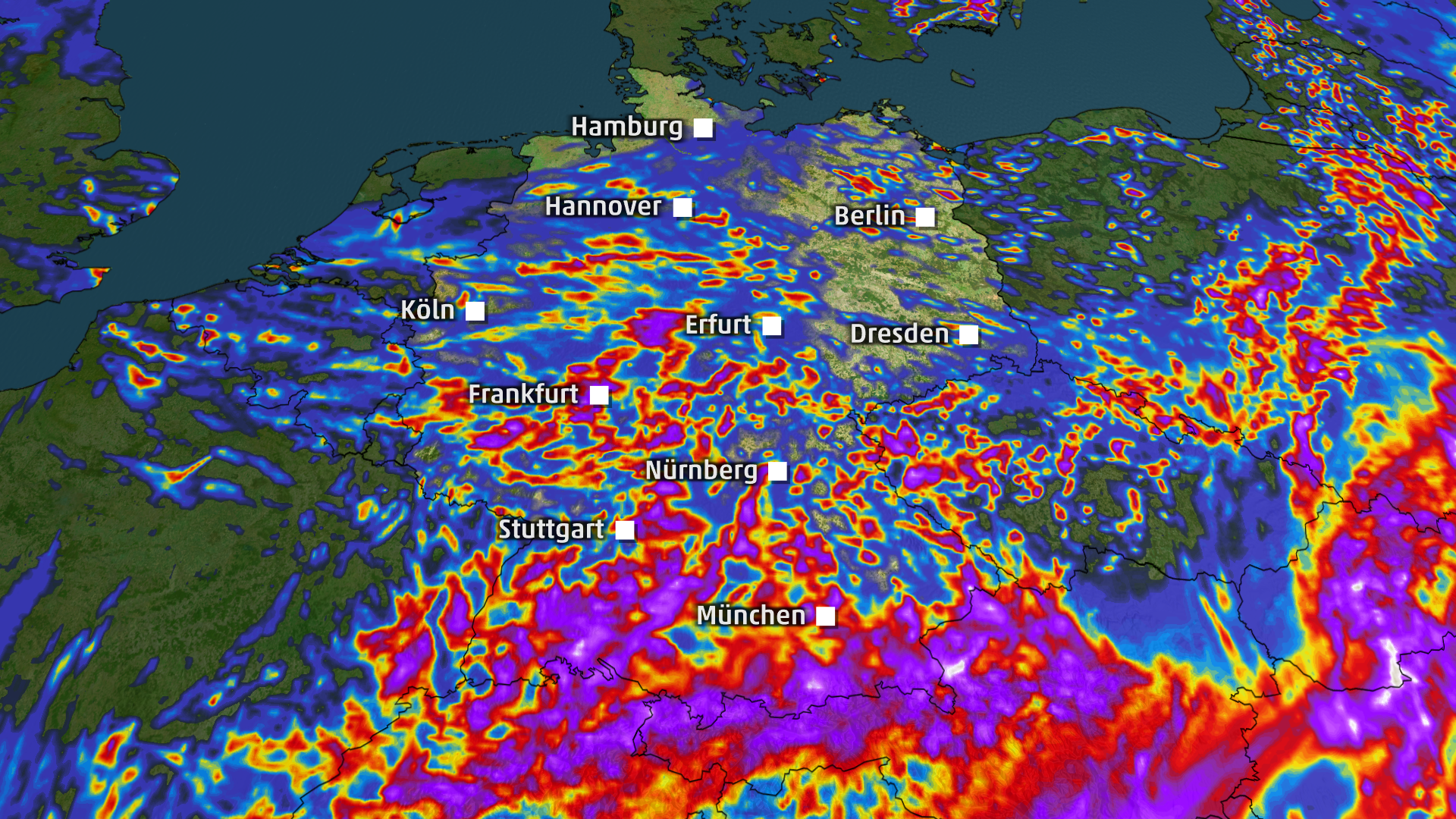 Am Freitag gibt es Schauer zwischen Frankfurt und Nürnberg, sowie ein paar ganz leichte Schauer, die von Nord- und Ostsee reinziehen. Auch im Süden gibt es Schauer und teilweise auch kurze Gewitter.