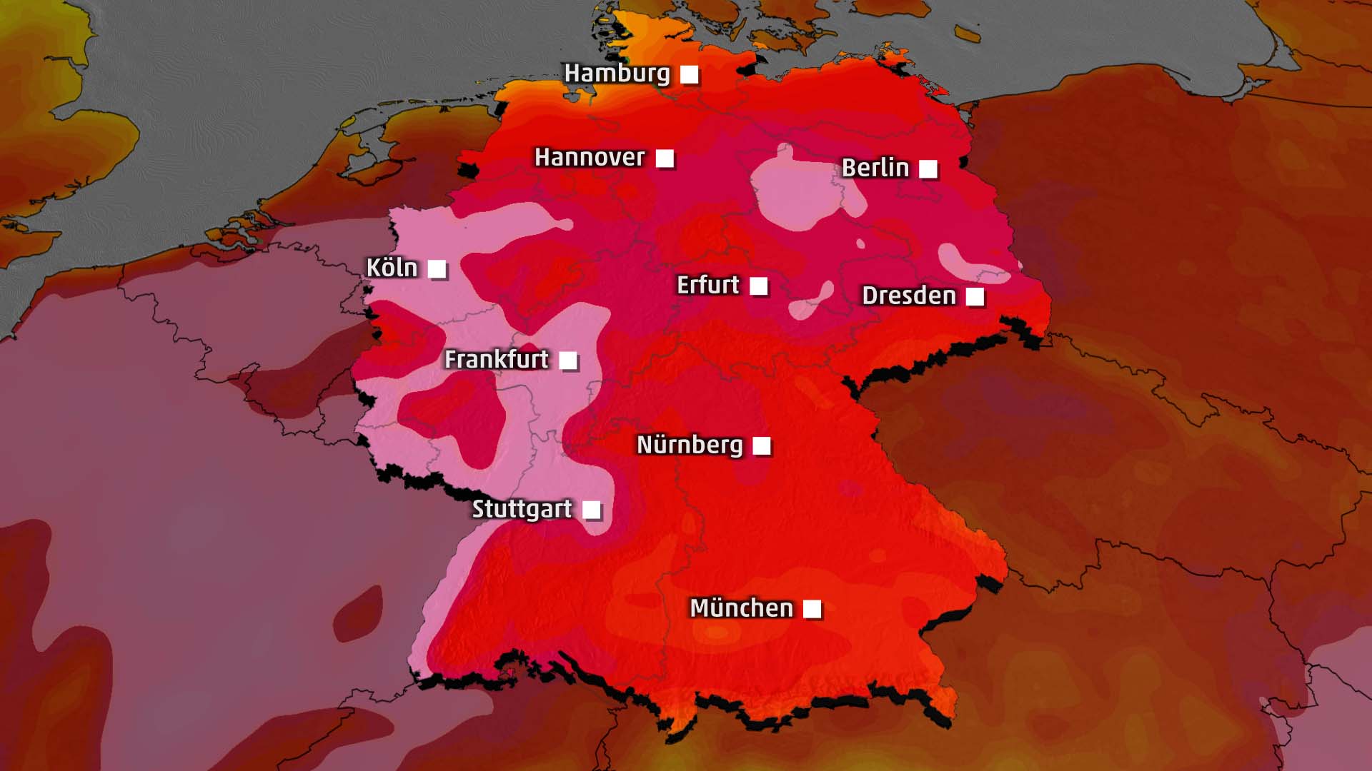 Am heutigen Montag sind bereits bis zu 29 Grad im Westen vorhergesagt. Örtlich können es dann auch bis zu 30 Grad werden. Der Dienstag wird noch heißer: Im Ruhrpott und im Rheinland bis hinunter nach Frankfurt und Stuttgart steigt das Thermometer auf über 30 Grad. Auch in Sachsen-Anhalt und in Brandenburg wird es nochmal bis zu 30 Grad heiß.