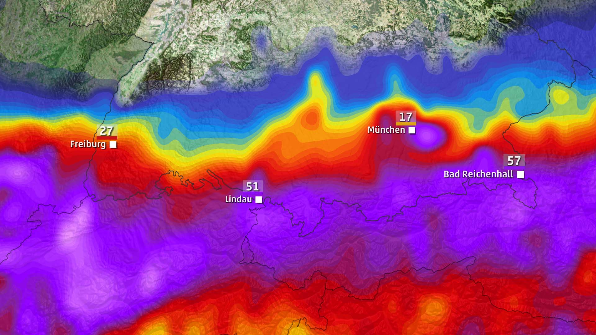 • Im Anschluss kommt es im Stau der Alpen zu Dauerregen bis in die Nacht zum Freitag