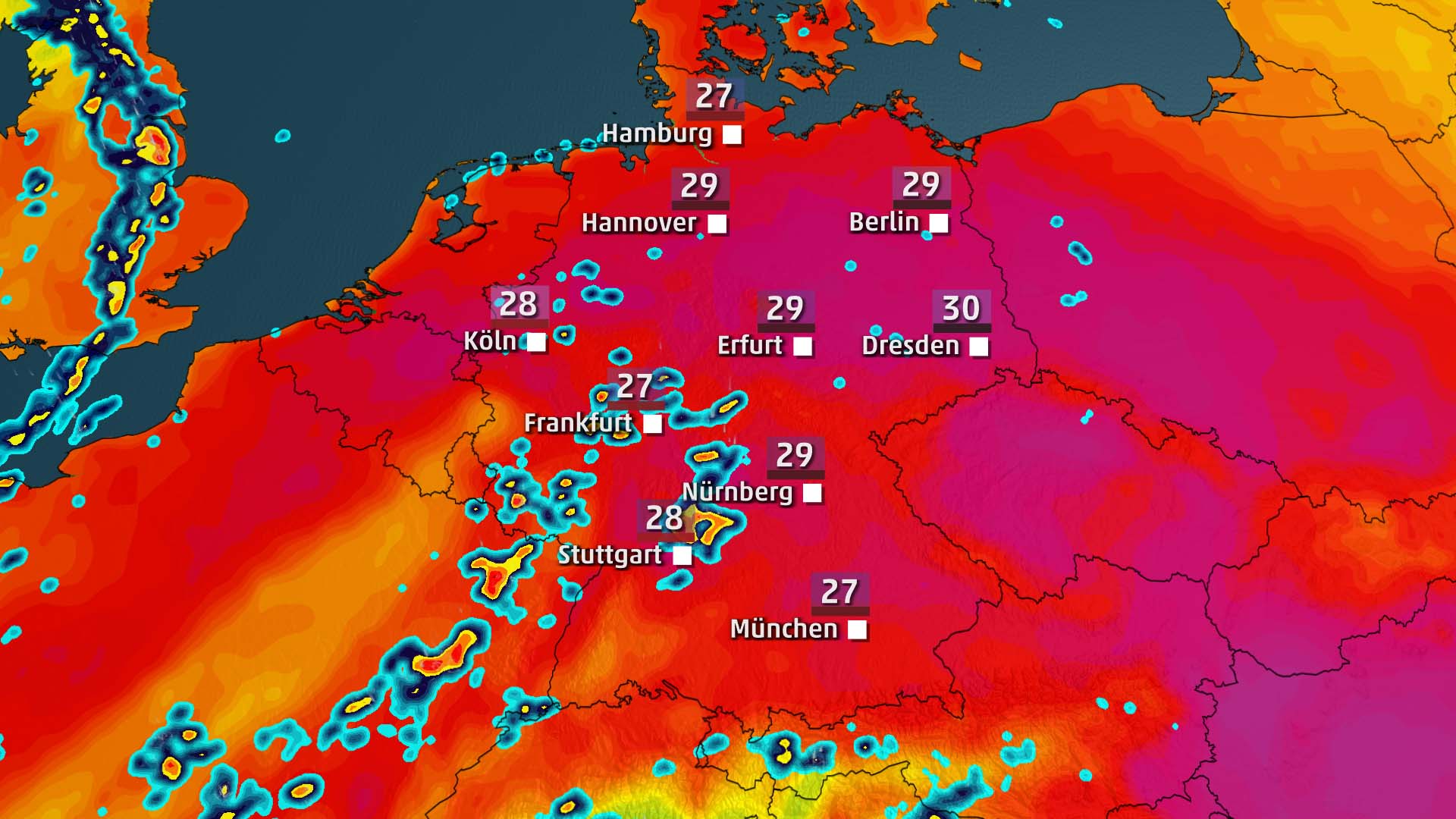 Am Mittwoch und Donnerstag kann es dann zu echten Schwergewitterlagen kommen, voraussichtlich mit viel Starkregen. Danach gibt es kräftige Regensignale für den Süden, die Mitte und den Osten. Gleichzeitig wird es kühler.