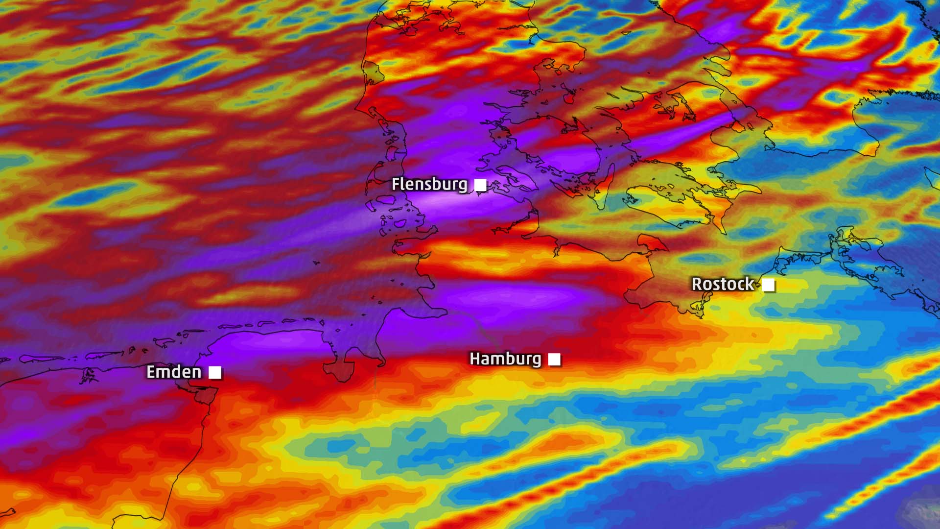 Der Wind trifft die Küsten am stärksten und auch Schleswig-Holstein (Das Windfeld über Kiel im Radar). Es wird aber auch einen anderen Unwetter-Schwerpunkt geben, denn es regnet stark. Bis Dienstagnachmittag fallen lokal bis zu 50 Liter Regen – bei sehr vielen Schauern und auch kurzen Gewittern. Auf einem Streifen von Ostfriesland bis Dithmarschen und vielleicht auch dem Norden Hamburgs wird es sehr nass.