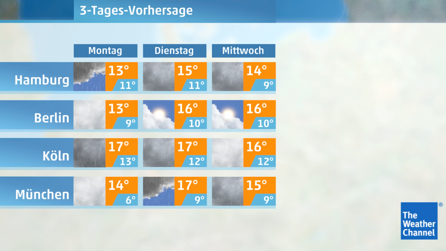 Am Montag setzt in der gesamten Westhälfte Regen ein, der oft schauerartig daherkommt. Mit jedem Kilometer nach Osten nimmt die Niederschlagsneigung zwar ab, doch bis zum Abend kann sich auch in der Osthälfte der Regen etablieren. Die Sonne ist dabei nur sehr selten zu sehen. Dazu kommt ein starker Südwestwind, der insbesondere in den westlichen Mittelgebirgen mit Sturmböen einhergehen kann. Hier besteht die Gefahr von umstürzenden Bäumen. Der Wind transportiert jedoch auch warme Luftmassen, sodass im Westen bis zu 19 Grad erreicht werden können, während es an der Ostsee mit 9 Grad am kältesten bleibt.