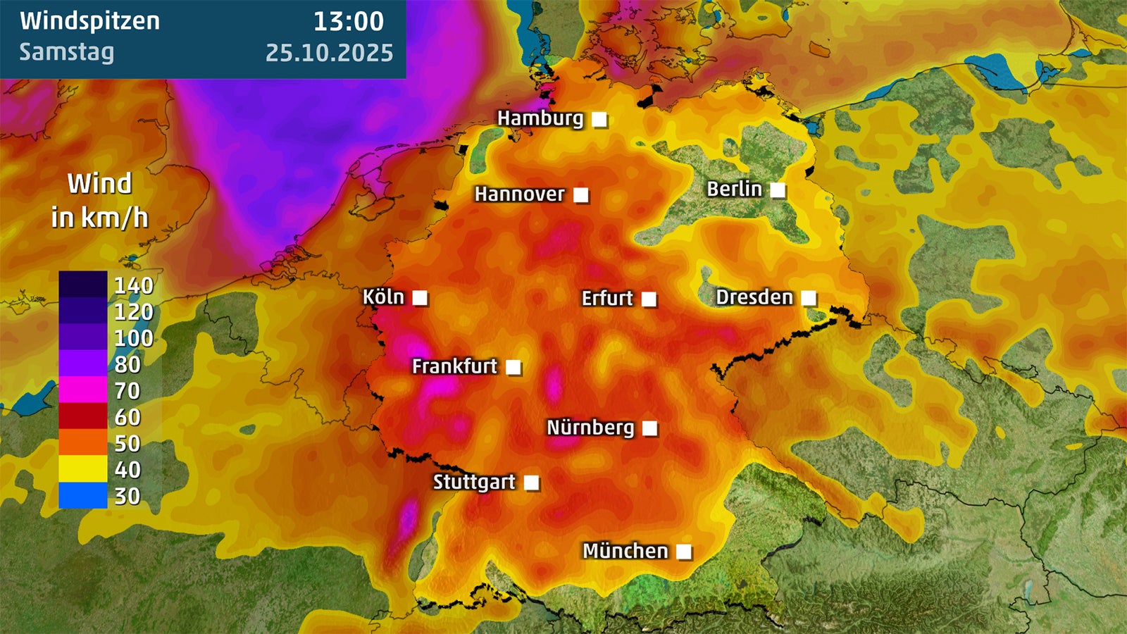 Ganz anders sieht es in den Mittelgebirgen aus: Hier soll die Kaltfront etwa gegen Mittag ankommen und bis zum Abend den Norden Bayerns und Sachsen erreichen. Während die Temperaturen vor der Front oft noch bei um die 10 Grad liegen, fällt das Thermometer bei Durchzug der Front und den einsetzenden kräftigen Niederschlägen stark ab.