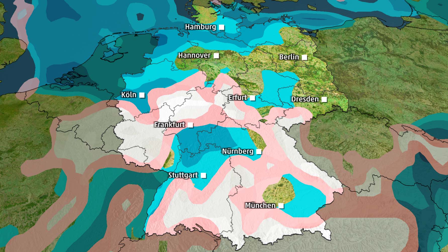 Aber dann zeichnet sich doch ein ziemlich harter Wetterwechsel ab. Die Strömung kippt auf Nord und kalte Luftmassen kommen nach Deutschland. Und das heißt: Ab Montag kann etwas Schnee in höheren Lagen fallen - ungefähr ab 500 Metern.