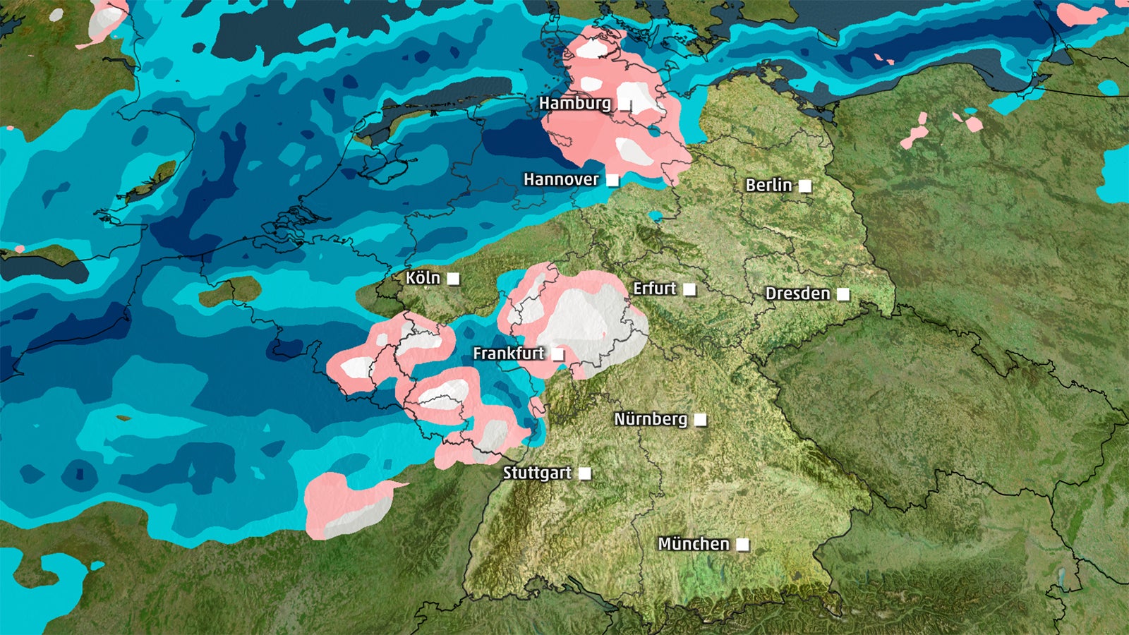 Am Mittwoch zieht das Tief Talat von Köln nach Hamburg und später über Rügen auf die Ostsee. Dadurch kann sich auch in tiefen Lagen Schnee zum Regen mischen.