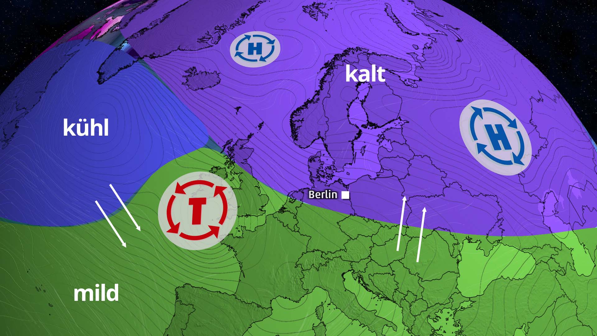 Auslöser ist der Polarjet, der ins Mittelmeer umgeleitet wird. Das starke Skandinavien-Hoch und auch das Russland-Hoch blockieren den Jet - gemeinsam mit der sibirischen Kaltluft. Eigentlich sollte die Kältewelle auch Deutschland erfassen, doch der Jet hat etwas dagegen. Er löst starke Tiefdruckgebiete aus, die den Vorstoß der Kältewelle aus Osten aufhalten.