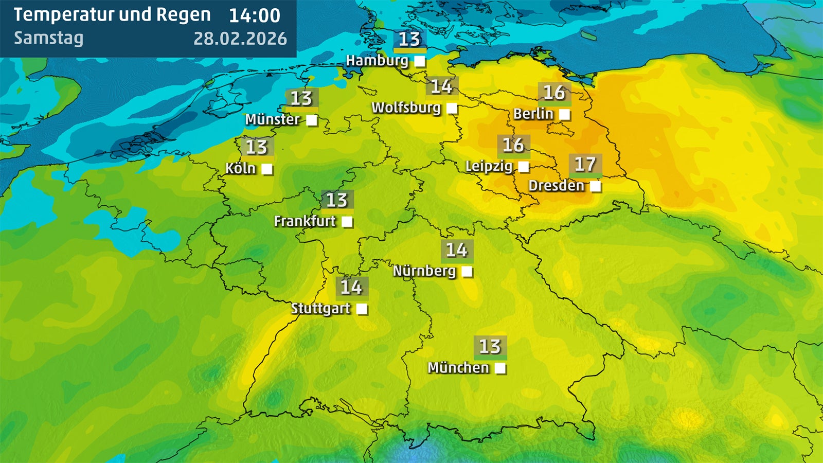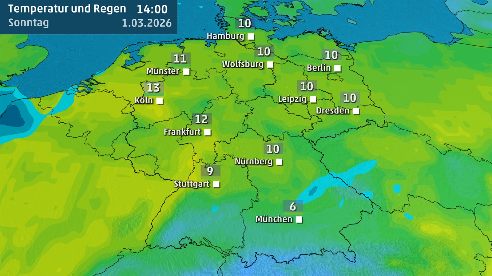 In der Westhälfte ziehen im Tagesverlauf zahlreiche lockere Wolkenfelder durch, die sich mit sonnigen Phasen abwechseln. Regen ist allerdings nur im äußersten Westen sowie im Nordseeumfeld zu erwarten. In direkter Küstennähe bleibt es aufgrund der derzeit niedrigen Wassertemperaturen mit Höchstwerten zwischen 4 und 8 Grad deutlich kälter.