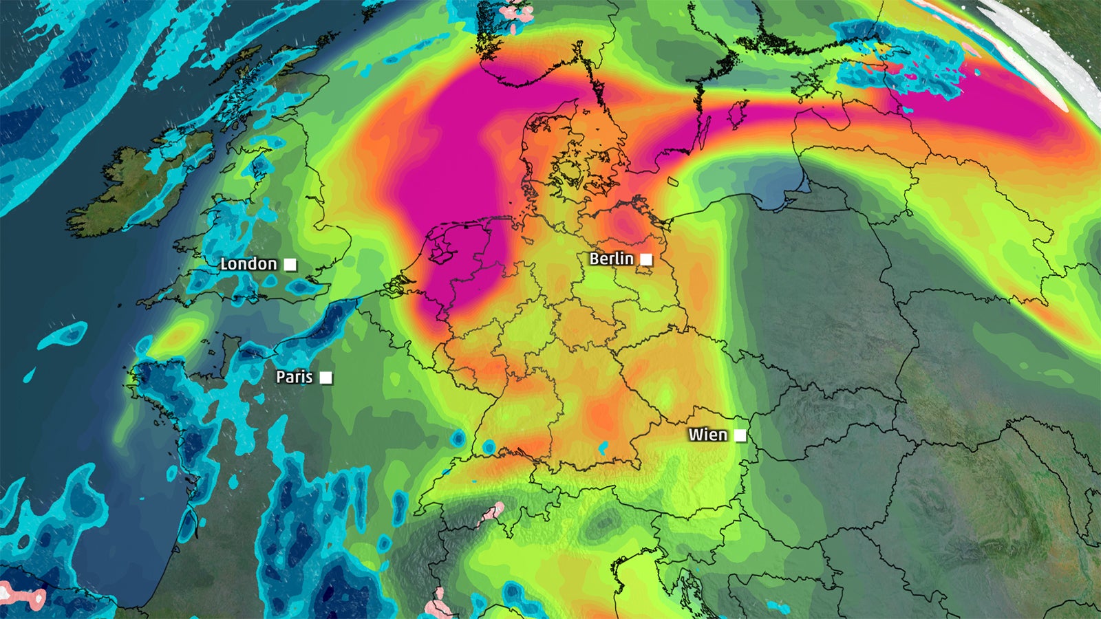 Am Mittwoch zieht eine Kaltfront herein und Regen setzt ein. Doch dann ist der Sahara-Staub schon weg. Der Regen am Mittwoch wird also definitiv kein Blutregen werden. Die Luft wird wieder deutlich klarer, aber es wird auch ein bisschen kühler.