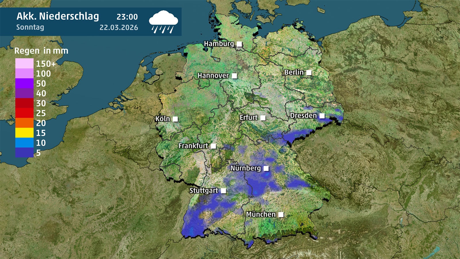In der Nacht zum Sonntag lockert es wieder auf, und letzte Schauer ziehen nach Südwesten ab. Unter klarem Himmel kühlt es rasch ab: In der Osthälfte und in Alpennähe werden frostige Werte erreicht, am Rhein im Westen sinken die Temperaturen auf etwa 5 Grad.